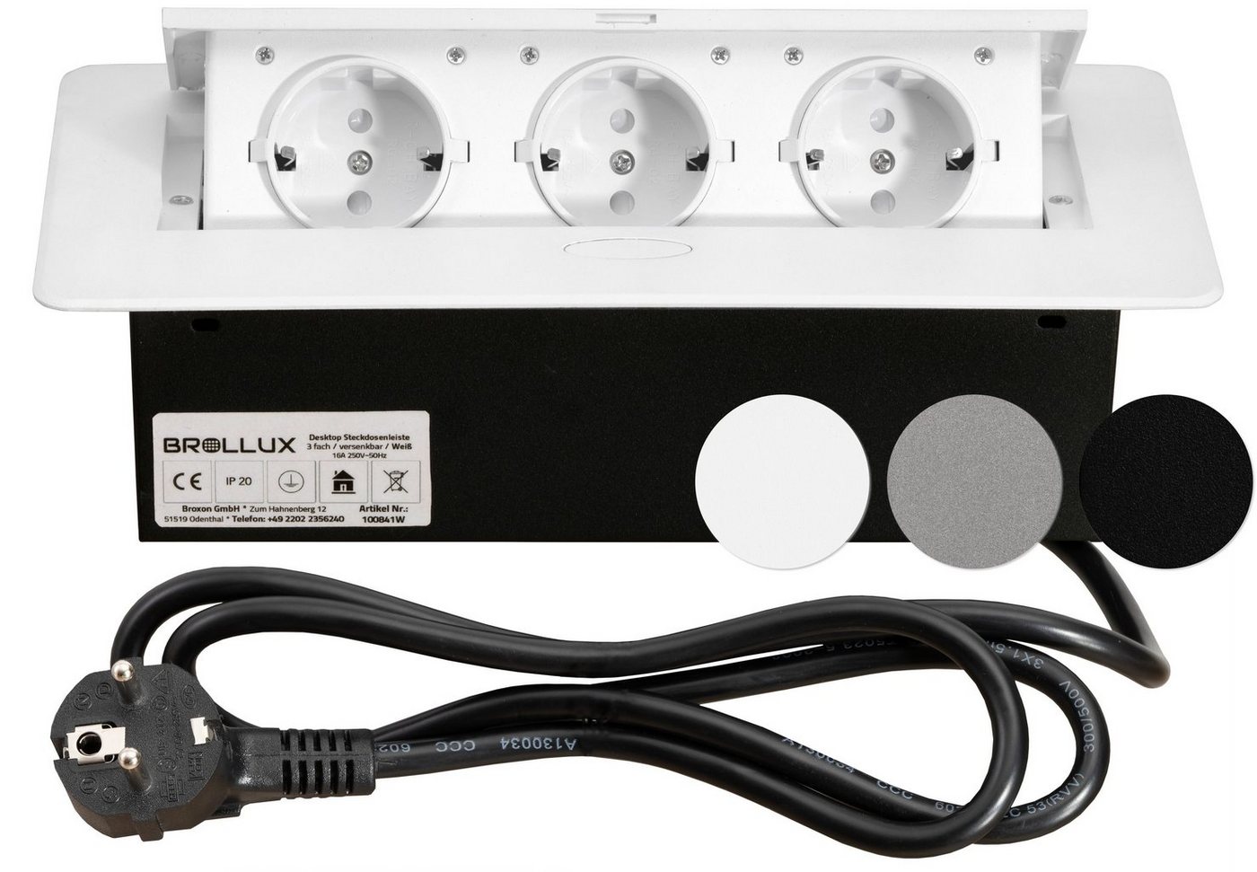 BROLLUX Einbausteckdose versenkbar Einbau-Tischsteckdosenleiste 3-fachweiß mit Softöffnung Alu Spritzguss, 1,5m Anschlusskabel