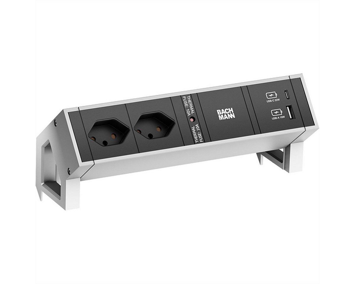 • Die Bachmann DESK2 Steckdosenleiste mit 2 Steckdosen und 1 USB Anschluss bietet erhöhten Berührungsschutz und eine Thermosicherung