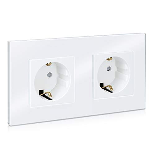 Navaris Glas Schuko Steckdose zweifach - Design Schutzkontakt Wandsteckdose mit Glasrahmen - Doppelsteckdose in Weiß