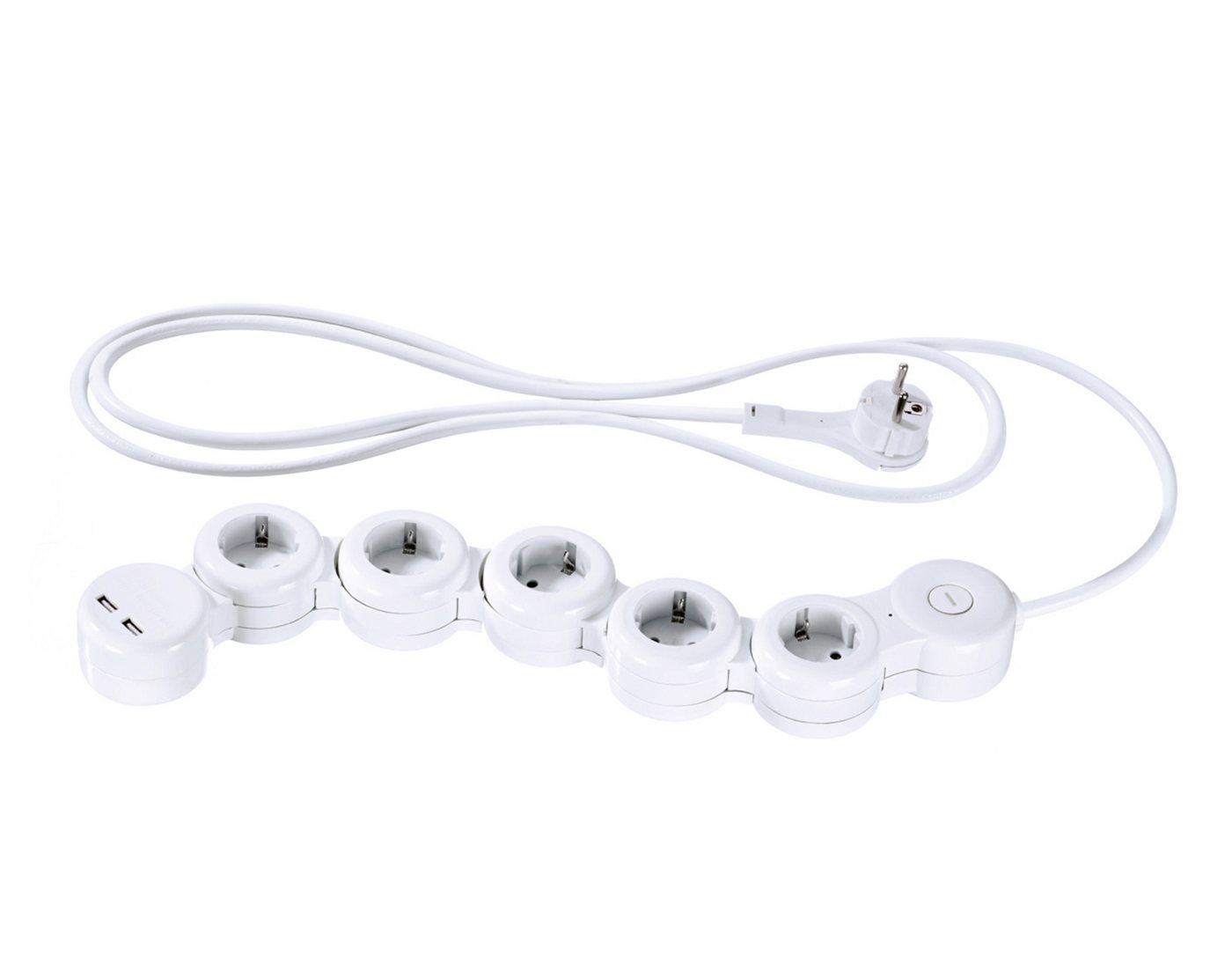 • Die flexible Steckdosenleiste in Weiß verfügt über 5 Steckplätze und 2 USB-Anschlüsse zum Laden von mobilen Geräten
