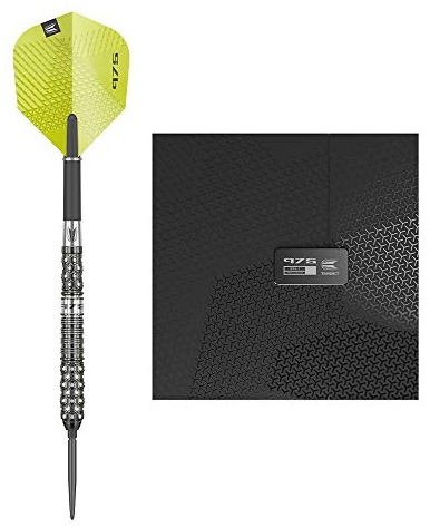 Target 975 02 Swiss Point Steeldarts mit einem Tungsten-Anteil von 97,5 %. Die exklusive 975 Dart Serie von Target ist von der vierten Version des Target Elysian Darts inspiriert und wurde nach seinem besonders hohen Wolfram-Anteil benannt. Der einzigartige Cell Grip verleiht dem Dart in Kombination mit Querrillen im Mittelteil einen besonderen Grip und sorgt für ein einzigartiges Wurfgefühl. Die schwarze Titan-Nitrid Beschichtung und die eingelaserte 975 im Barrel vollendet das außergewöhnliche Design. Die Darts sind mit dem Target Swiss Point System ausgestattet und sind in drei verschiedenen Barrelformen erhältlich. Swiss Point ist ein patentiertes Spitzensystem, mit dem die Spitzenlänge, der Stil und die Farbe in Sekundenschnelle geändert werden kann. Auch eine Metallspitze kann brechen, wenn sie ungünstig auf dem Board aufkommt. Das kann nach dem ersten oder dem tausendsten Wurf passieren. Mit dem Swiss Point System ist das kein Problem mehr! Eine strategisch ausgelegte Nut stellt sicher, das gebrochene Spitzen einfach entfernt werden können. Das Swiss Point Tool im Taschenformat ist alles, was man zum Entfernen und Montieren der Spitzen benötigt. Ein ausgeklügeltes Verriegelungssystem mit Kegel- und Gewindetechnik sorgt dafür, dass sich Ihre Spitzen während des Spiels nicht lösen. Swiss Points sind nur mit Target Darts SP Barrels kompatibel! Bei uns findet ihr ein großes Angebot an Swiss Point Wechselspitzen! Das Set kommt mit schwarzen Target Carbon-Ti Shafts (Short) und Target Pro.Ultra 975 Flights mit doppelseitigem Design. Ebenfalls enthalten: 1 x Target Takoma Dartcase im 975 Design. 1 x Swiss Point Key Premium 1 x 975 Anstecker 1 x Set Swiss Point Ersatzspitzen 2 x Set Ersatzflights 9 x Flight Protector