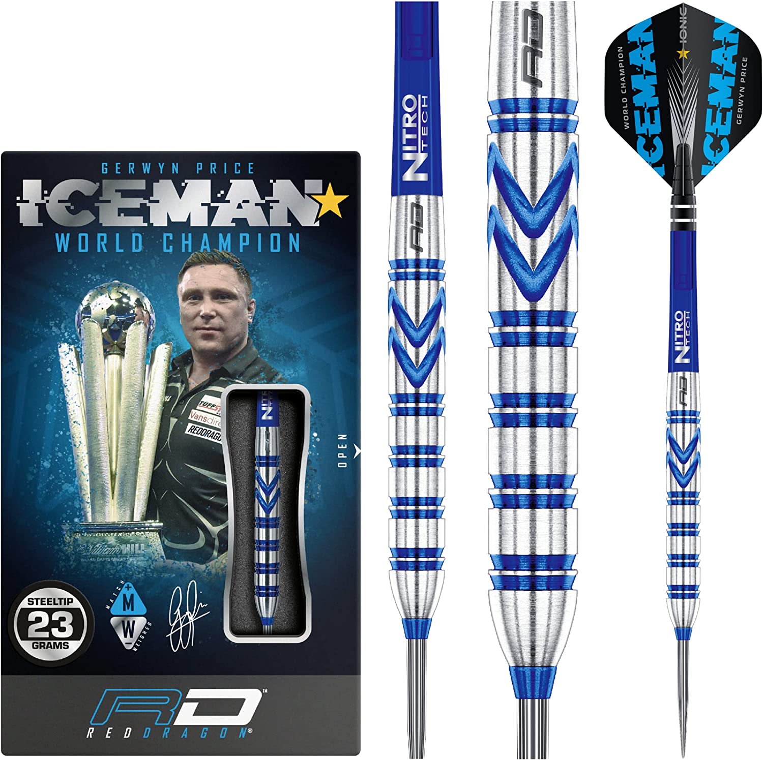 Red Dragon Gerwyn Iceman Price Original Steeldarts 90% Tungsten Steeldarts Die für "Iceman" Gerwyn Price entwickelten Steeldarts haben zwei Griffzonen. Im vorderen Bereich hat das Barrel Abstufungsrillen mit hohem Grip und im hinteren Barrel Bereich einen Wellengrip mit mittlerem Griplevel. Dieser Dartpfeil ist in unterschiedlichen Gewichten erhältlich. Features: • Material: 90% Tungsten • Gewichtsverteilung: mittig • Barrel Profil: Eliptisch • Gripart: Abstützrillen/ Wellen • Grip Level: 4 • Grip Zone: komplett • Schaft: Nitrotech Blue • Flights: 100 Micron Hardcore • Spitzen: Steeltip glatt Lieferumfang: • ein Set Darts im von Dir gewünschten Gewicht • ein Set Flights • ein Set Dart Schäfte Abmessungen: 23 Gramm • Barrelgewicht: 23 Gramm • Barrellänge: 50,8 mm • Barreldurchmesser: 6,4 mm 24 Gramm • Barrelgewicht: 24 Gramm • Barrellänge: 50,8 mm • Barreldurchmesser: 6,7 mm 26 Gramm • Barrelgewicht: 26 Gramm • Barrellänge: 50,8 mm • Barreldurchmesser: 6,85 mm Dieser Dart ist etwas für Dich, wenn Du ein Barrel bevorzugst, das Dir viel Grip und Kontrolle über die ganze Länge des Barrels vermittelt