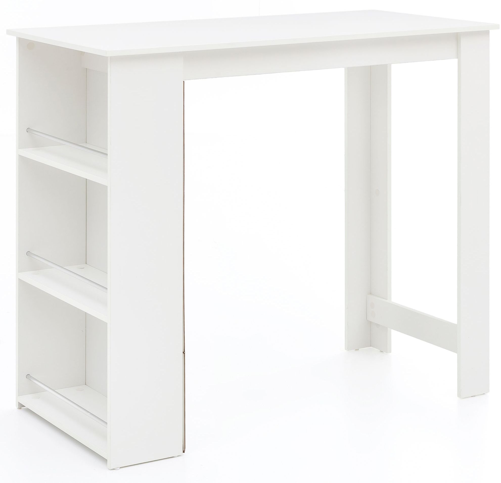 Der Stehtisch aus melaminharzbeschichteter Spanplatte ist ideal für Ihre Küche oder Ihr Wohnzimmer. Mit einer Breite von 120 cm, einer Höhe von 107,5 cm und einer Tiefe von 60 cm bietet er ausreichend Platz für Getränke, Geschirr und Snacks. Das integrierte Regal mit drei Fächern sorgt für zusätzlichen Stauraum und die silberfarbenen Streben verhindern das Herausfallen der Gegenstände. Die kratzfeste und wasserabweisende Oberfläche macht ihn besonders pflegeleicht. **Highlights** - Bartisch im modernen, geradlinigen Design - Große Ablagefläche für Getränke, Geschirr und Snacks - Drei Fächer zur Unterbringung von Weinflaschen, Gläsern und Küchenutensilien - Silberfarbene Streben zieren die Regalfächer - Weiße Anti-Rutsch-Noppen schützen Ihren Boden vor unschönen Kratzern **Produkteigenschaften** - Maße (HxBxT): 107,5 x 120 x 60 cm - Innenmaße je Regalfach (BxHxT): 53 x 33,5 x 16,5 cm - Maximale Belastbarkeit der Tischplatte: 40 kg - Maximale Belastbarkeit je Regalfach: 8 kg - Farbe: Weiß - Material Tisch und Regal: melaminharzbeschichtete Spanplatte - Streben: Aluminium **Lieferumfang** - Ein Stehtisch ohne Dekoration - Montageanleitung und -material inkl.