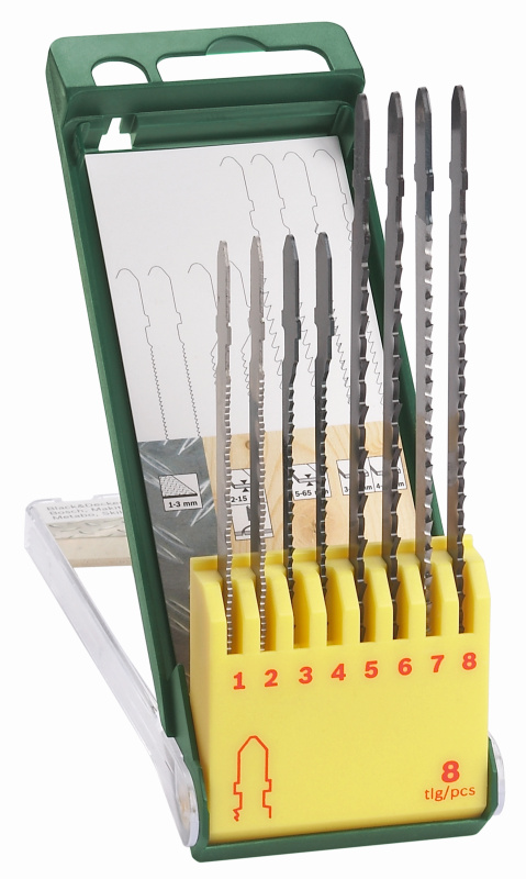Vielseitiges Set mit 8 Sägeblättern, optimal abgestimmt auf Holz, Metall und Kunststoff.