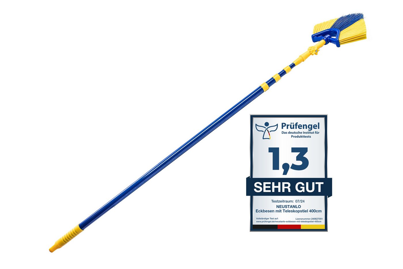Der Neustanlo Teleskopstiel Eckbesen ist ein praktisches Reinigungswerkzeug, das sich auf ca. 4 m ausziehen lässt und sich gut handhaben lässt. Der Bürstenkopf ist aus qualitativ hochwertigem Kunststoff, der die Ecken schonend abkehren kann. Allerdings ist die Feststellschraube nicht besonders stabil und die Rohre wirken dünnwandig, was zu einer gewissen Wackeligkeit bei voller Länge führen kann.