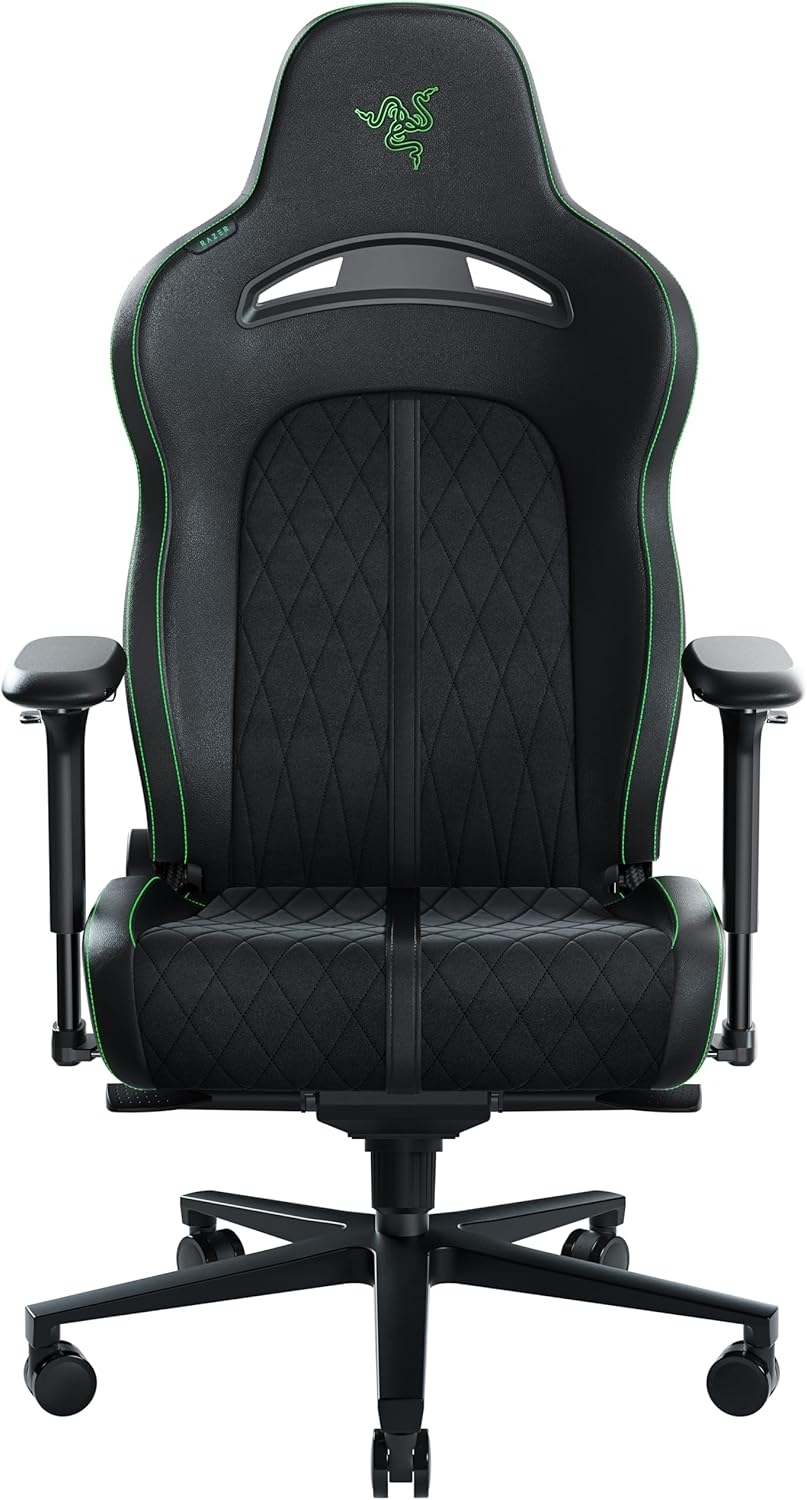 Der Razer Enki Stuhl bietet Ihnen den ultimativen Komfort für lange Gaming-Sessions. Mit einer Tragkraft von 136 kg und einem verstellbaren Neigungswinkel von bis zu 152° sorgt er für eine optimale Gewichtsverteilung. Die Kombination aus 110-Grad-Schulterbögen und einer 53 cm breiten Sitzfläche fördert eine gesunde Haltung. Der integrierte Lordosenbogen unterstützt den unteren Rücken, während die doppelt verdichtete Rückenlehne für besten Halt sorgt. **Highlights** - Tragkraft von 136 kg für hohe Stabilität - Verstellbarer Neigungswinkel bis zu 152° für individuelle Anpassung - Integrierter Lordosenbogen zur Förderung einer neutralen Haltung - 110-Grad-Schulterbögen für optimale Gewichtsverteilung - Magnetisches Kopfpolster aus Memory-Schaumstoff für zusätzlichen Komfort **Produkteigenschaften** - Maße (Sitzfläche): 53 cm Breite - Material: hochdichter Polyurethan-Formschaum, Elastomer-Polyurethan (EPU) - Bezug: Alcantara und nachhaltiges Premium-Kunstleder - Doppelt verdichtete, gepolsterte Rückenlehne für optimalen Rückenkomfort - Reaktive Mechanik, die sich an Ihr Gewicht anpasst