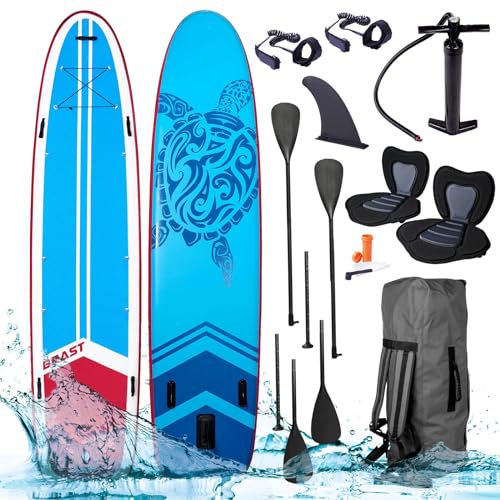Das BRAST® SUP Board Family ist ein aufblasbares Stand-Up-Paddle-Board, das sich gut für Familien und Anfänger eignet. Es bietet eine hohe Stabilität und eine Tragfähigkeit von bis zu 210 kg. Das Board kommt mit umfangreichem Zubehör, darunter zwei Paddel und Kajaksitze. Nutzer berichten von einer guten Manövrierfähigkeit und einem soliden Fahrverhalten. Allerdings wird der fehlende zentrale Tragegriff kritisiert, was den Transport erschwert. Einige kleinere Mängel wie die Position des Deck-Pads und die Größe der Tragetasche wurden ebenfalls erwähnt.