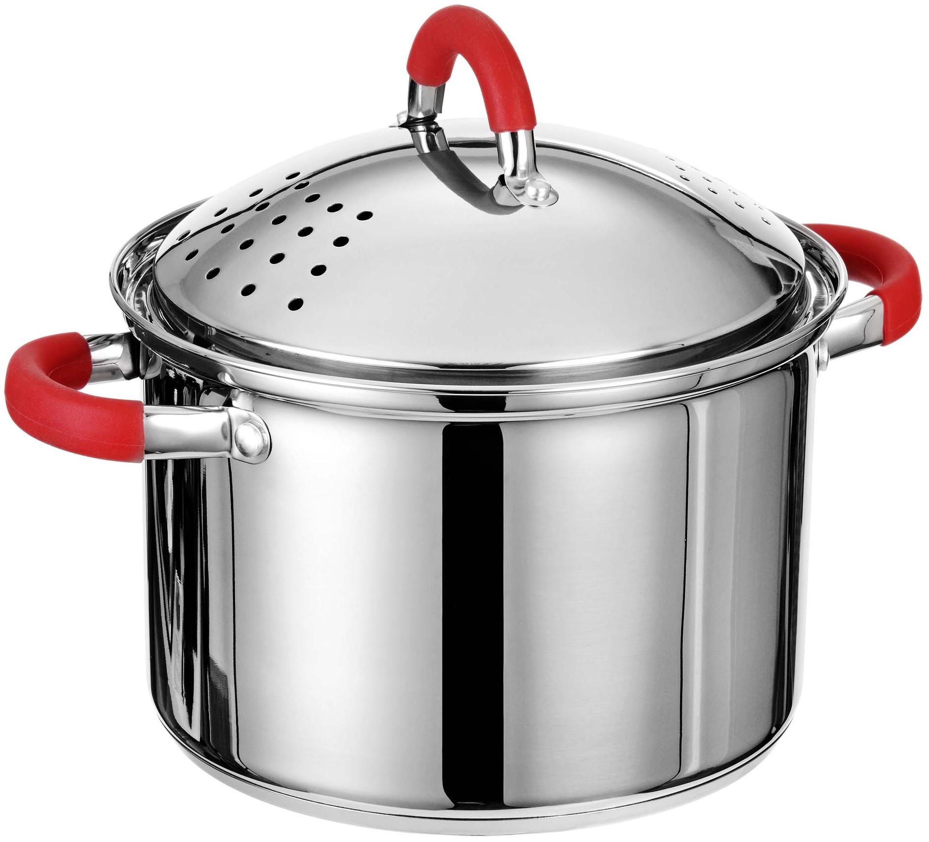 Der GRÄWE Nudeltopf aus Edelstahl mit einem Durchmesser von 22 cm ist der ideale Küchenhelfer für das mühelose Nudelkochen. Dank der integrierten Siebfunktion im Deckel können Sie die Nudeln direkt abgießen, ohne ein separates Sieb verwenden zu müssen. Der Topf hat ein Fassungsvermögen von 5 Litern und ist für alle Herdarten geeignet. **Highlights** - Nudeltopf mit integrierter Siebfunktion im Deckel - Zwei unterschiedlich große Lochungen zum Abgießen des Wassers - Sicherer Halt des Deckels durch angebrachte Nuten - Griffe mit rotem Kunststoff ummantelt für angenehmes Anheben und Tragen - Fassungsvermögen von 5 Litern **Produkteigenschaften** - Material: Edelstahl 18/10 Chromnickelstahl - Boden: Thermokapsel-Boden mit Aluminium und Chromstahl (3 mm Aluboden, 0,5 mm Platte aus 18/0 Chromstahl) - Liter-Skala an der Innenwand - Maße: Höhe gesamt (mit Deckel) ca. 24 cm, Höhe (ohne Deckel) ca. 15,5 cm, Breite gesamt (mit Henkel) ca. 31,5 cm, Durchmesser innen ca. 21,8 cm, Durchmesser ca. 23,7 cm - Lochungen im Deckel: Durchmesser ca. 5 mm und 3 mm - Gewicht: ca. 1,25 kg **Lieferumfang** - 1 Nudeltopf Edelstahl - Maße: Höhe ges. (mit Deckel) ca. 24 cm, Höhe (ohne Deckel) ca. 15,5 cm, Breite ges. (mit Henkel) ca. 31,5 cm, Ø innen ca. 21,8 cm, Ø ca. 23,7 cm, Lochungen im Deckel: Ø ca. 5 mm und 3 mm, Füllvolumen: 5 L - Gewicht ca. 1,25 kg