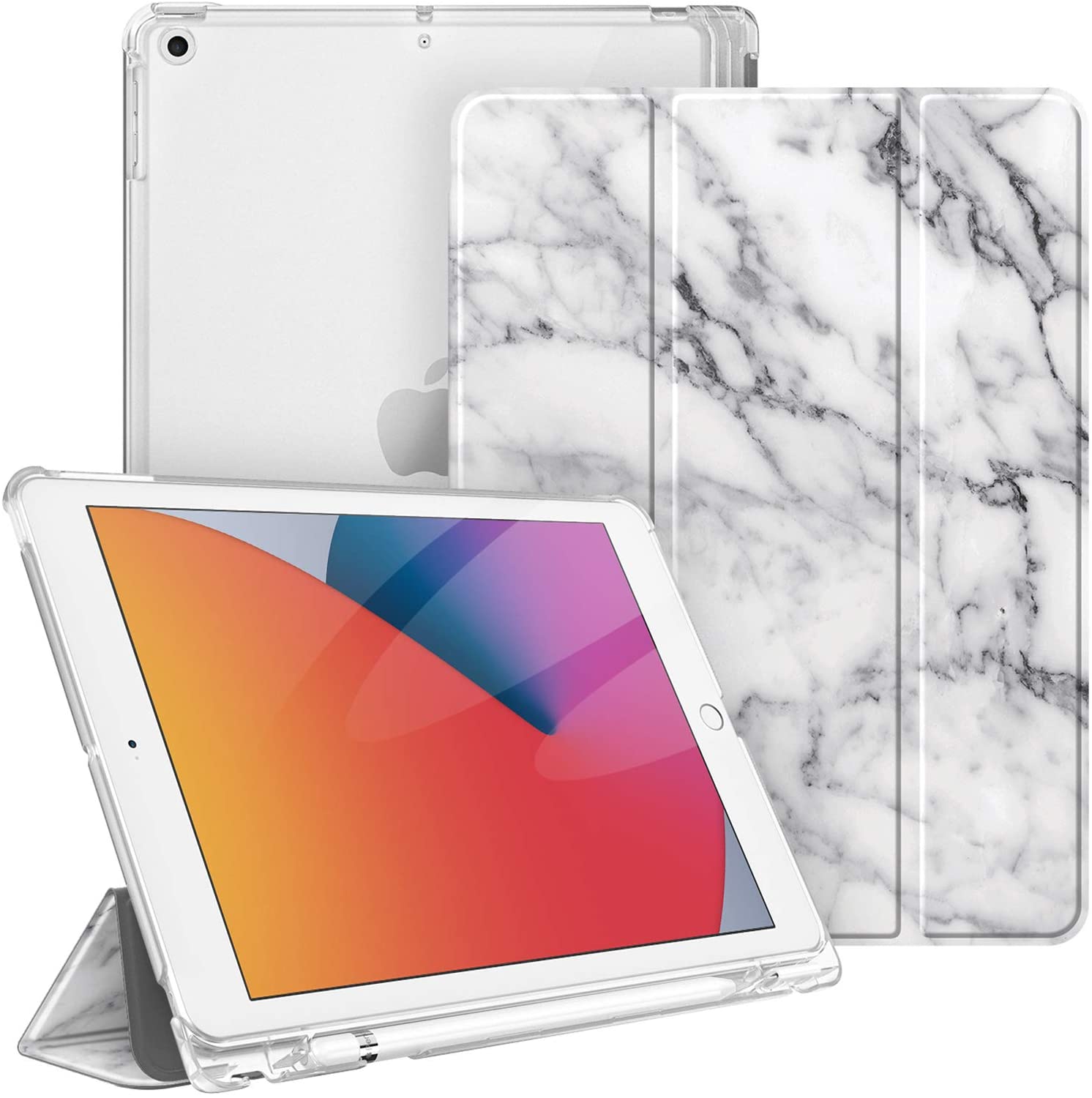 Die Fintie Hülle für iPad 8. Generation - 7. Gen 10.2 Zoll mit Pencil Halter ist eine tolle Hülle mit einem hochwertigen Muster, die das iPad gut schützt. Besonders der Stifthalter ist ein Pluspunkt. Ein Nachteil ist jedoch, dass das iPad nicht stehen bleibt und angelehnt werden muss.