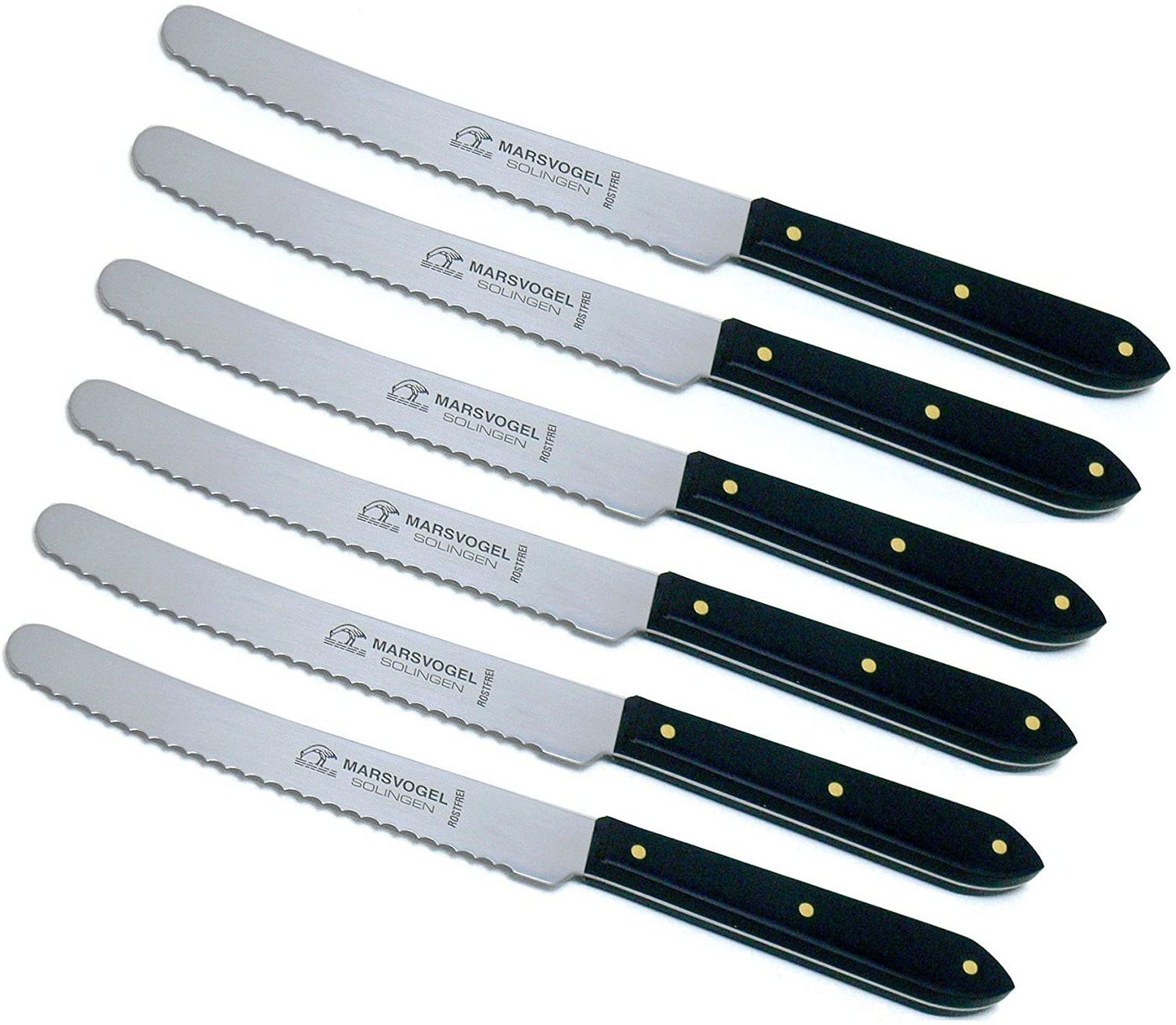 Erleben Sie mit dem Marsvogel Tafelmesser Set die perfekte Kombination aus Funktionalität und Stil. Jedes der 6 hochwertigen Tafelmesser verfügt über eine spitze, durchgehende Klinge aus rostfreiem Chromstahl (AISI 420 / DIN X46 Cr13) mit Wellenschliff. Die polierten, dreifach genieteten Griffschalen aus POM (Polyoxymethylen) sorgen für einen sicheren Halt. Mit einer Klingenlänge von ca. 11,50 cm und einer Gesamtlänge von ca. 21,00 cm sind diese Messer ideal für jeden Tisch. **Highlights** - Hochwertige Solinger Klinge für exzellente Schneideleistung - Wellenschliff für müheloses Schneiden von Brot und anderen Lebensmitteln - Robuste und rostfreie Materialien für Langlebigkeit - Stilvolles Design, das jeden Tisch aufwertet - Dreifach genietete Griffschalen für zusätzlichen Halt und Komfort **Produkteigenschaften** - Klingenlänge: ca. 11,50 cm - Gesamtlänge: ca. 21,00 cm - Material: rostfreier Chromstahl (AISI 420 / DIN X46 Cr13) / poliert - Griffmaterial: POM (Polyoxymethylen) **Lieferumfang** - 6 Tafelmesser - Ausschluss: Weitere Besteckteile sind nicht enthalten