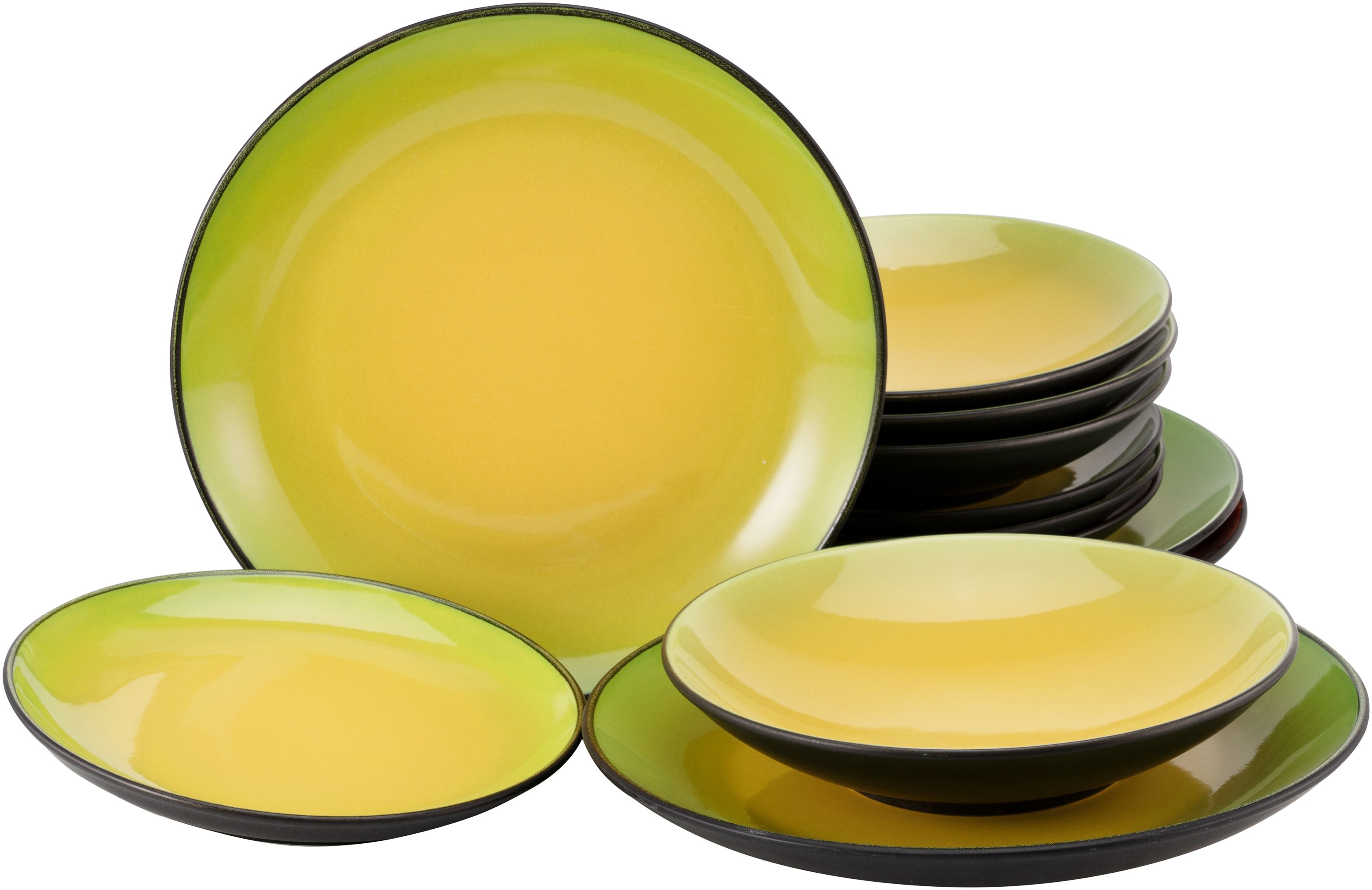 CreaTable 20229 Tafelservice Hot Green für 4 Personen, bestehend aus 12 Teilen, vereint Funktionalität und Stil. Das Set aus hochwertigem Steinzeug in einer intensiven grün/gelben Farbgebung umfasst 4 Speiseteller (27 cm), 4 Dessertteller (21 cm) und 4 Suppen-/Salat-/Pastateller (22 cm). Die moderne Coupeform und der asiatische Look machen dieses Geschirr zu einem besonderen Highlight auf jedem Tisch. **Highlights** - Hochwertiges Steinzeug für Langlebigkeit - Spülmaschinen- und mikrowellengeeignet für einfache Reinigung - Intensive Farbgebung für einen auffälligen Look - Einzigartiger asiatischer Stil für besondere Anlässe **Produkteigenschaften** - Set-Bestandteile: 4x Speiseteller (27 cm), 4x Dessertteller (21 cm), 4x Suppen-/Salat-/Pastateller (22 cm) - Farbe: grün/gelb - Material: Steinzeug **Lieferumfang** - 4 Speiseteller (27 cm) - 4 Dessertteller (21 cm) - 4 Suppen-/Salat-/Pastateller (22 cm) - Keine weiteren Produkte enthalten