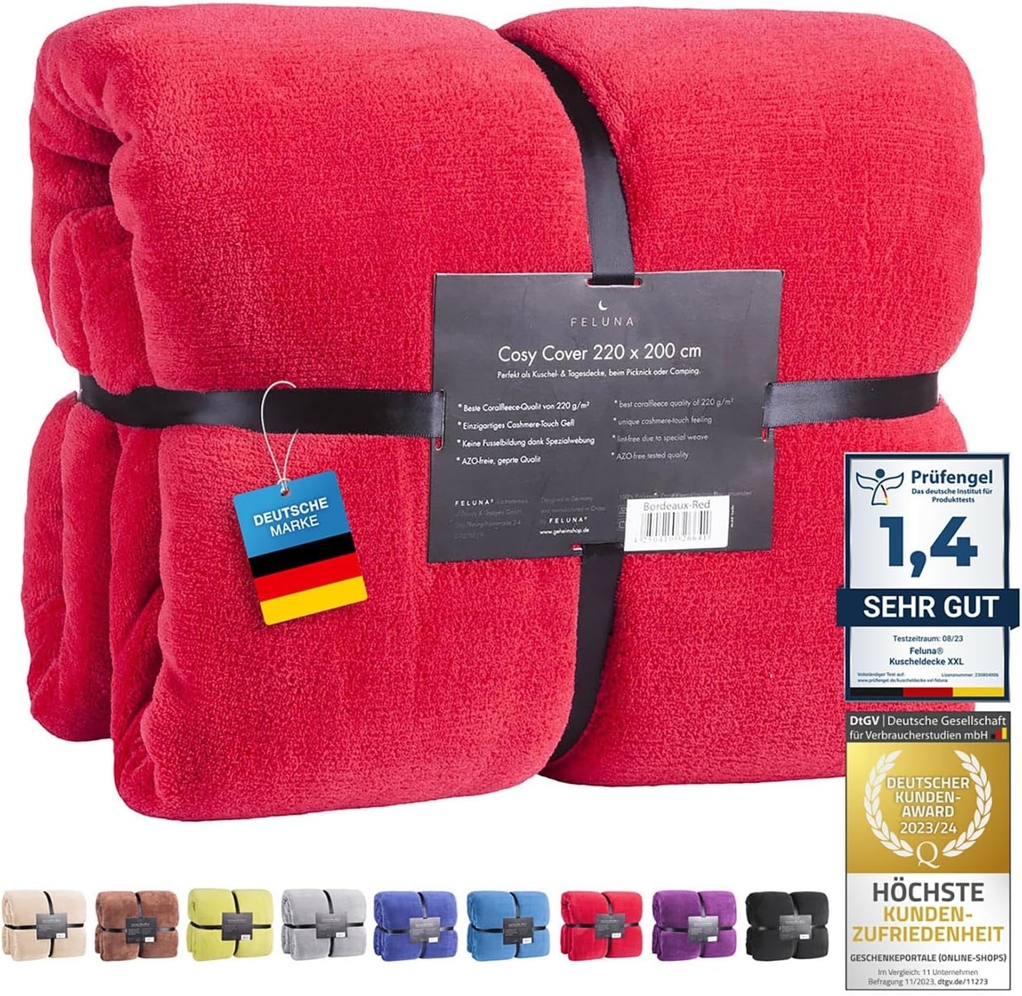 Wohndecke Kuscheldecke XXL von Feluna bietet mit ihren großzügigen Abmessungen von 220x200 cm optimalen Komfort und Zudeckfläche. Hergestellt aus hochwertigem Coral-Fleece, vermittelt sie den luxuriösen Kaschmir-Touch. Diese Decke ist fusselfrei und extrem langlebig, ideal für gemütliche Stunden zu zweit. **Highlights** - XXL Maße von 220x200 cm für ausreichend Zudeckfläche - Hergestellt aus hochwertigem Coral-Fleece für ein angenehmes Gefühl - Kaschmir-Touch Komfort für ein luxuriöses Kuschelerlebnis - Fusselfrei dank spezieller Verarbeitungstechnik - Extrem langlebig für dauerhaften Gebrauch **Produkteigenschaften** - Farbe: 9 verschiedene Farben verfügbar - Material: Coral-Fleece