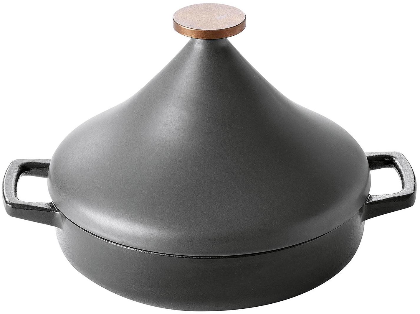 Die BEKA Nori Tajine mit einem Durchmesser von 28 cm ist ideal für die Zubereitung köstlicher Fleisch-, Fisch- oder Gemüse-Tajine. Ihr zeitloses Design mit bronzefarbenem Knauf und schwarzem Gusseisen macht sie zu einem echten Blickfang in Ihrer Küche. Die dreifache Emailleschicht sorgt für eine einfache Reinigung, während der konische Deckel und die gleichmäßige Wärmeverteilung optimale Ergebnisse garantieren. **Highlights** - Zeitloses Design mit bronzefarbenem Knauf - Dreifache Emailleschicht für einfache Reinigung - Konischer Deckel für zarte und aromatische Gerichte - Gleichmäßige Wärmeverteilung dank gusseisernem Material - Für alle Herdarten, inklusive Induktion, geeignet **Produkteigenschaften** - Durchmesser: 28 cm - Farbe: schwarz - Material: Gusseisen - Geeignet für alle Herdarten, inkl. Induktion - Auch für Ofen und Grill geeignet