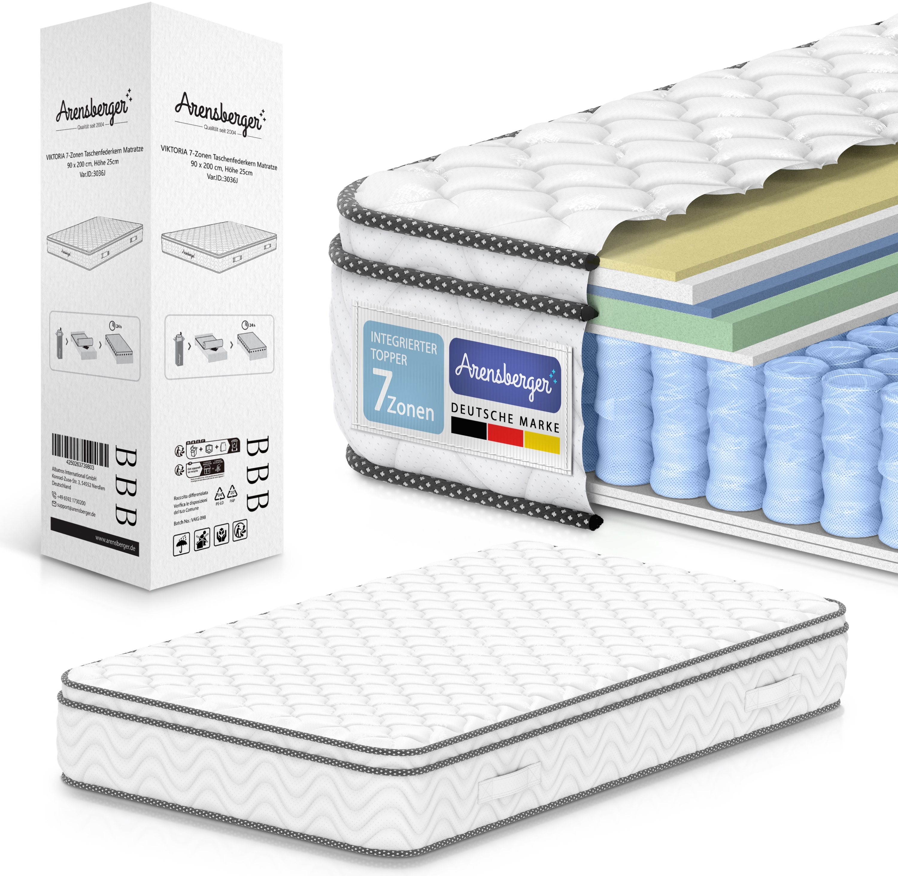 - **ARENSBERGER:** Unser Anspruch ist gesunder Schlaf. Die Arensberger VIKTORIA Matratze ist in 6 Schichten aufgeteilt: Atmungsaktive Klimafaser versteppt mit Doppeltuch + 2 cm Kaltschaum + 3 cm Memory Schaum + Schutz Vlies + Taschenkernfedern + Schutz Vlies. Der Taschenfederkern sorgt für die optimale Anpassung der Bereiche von Schulter, Lenden und Becken sowie der Wirbelsäule. - **INTEGRIERTER TOPPER:** Die ersten 3 Schichten (Klimafaser versteppt mit Doppeltuch + 2 cm Kaltschaum + 3 cm Memory Schaum) bilden einen integrierten Topper für noch mehr Komfort! - **ERGONOMISCH:** Die hohe Anzahl von 640 Federn (Maß 140x200 cm) sorgt für eine exzellente Punktelastizität und körpergerechte Unterstützung der HWS/Halswirbelsäule in allen Bereichen. Jede Feder ist separat in einer Stofftasche eingenäht. Es besteht keine Verbindung zwischen den Federn - so kann jede Feder unabhängig von der anderen arbeiten. Im Vergleich zu konventionellen Matratzen mit Federkern sind die Taschenfederkern-Matratzen auch für zwei Personen bestens geeignet. - **UNIVERSELL:** Die VIKTORIA Matratze ist universell konzipiert und für jedes Körpergewicht geeignet. (Härtegrad H2 bis H4, ab 50kg bis 150kg pro Person) - **HOCHWERTIGE MATERIALIEN:** Wir verwenden ausschließlich Materialien von hoher Qualität. Dies ist nicht nur gut für uns, sondern schont auch unsere Umwelt. Die hochwertige Verarbeitung der Materialien sorgt für beste Tragfähigkeit und langlebige Rückstellkraft.