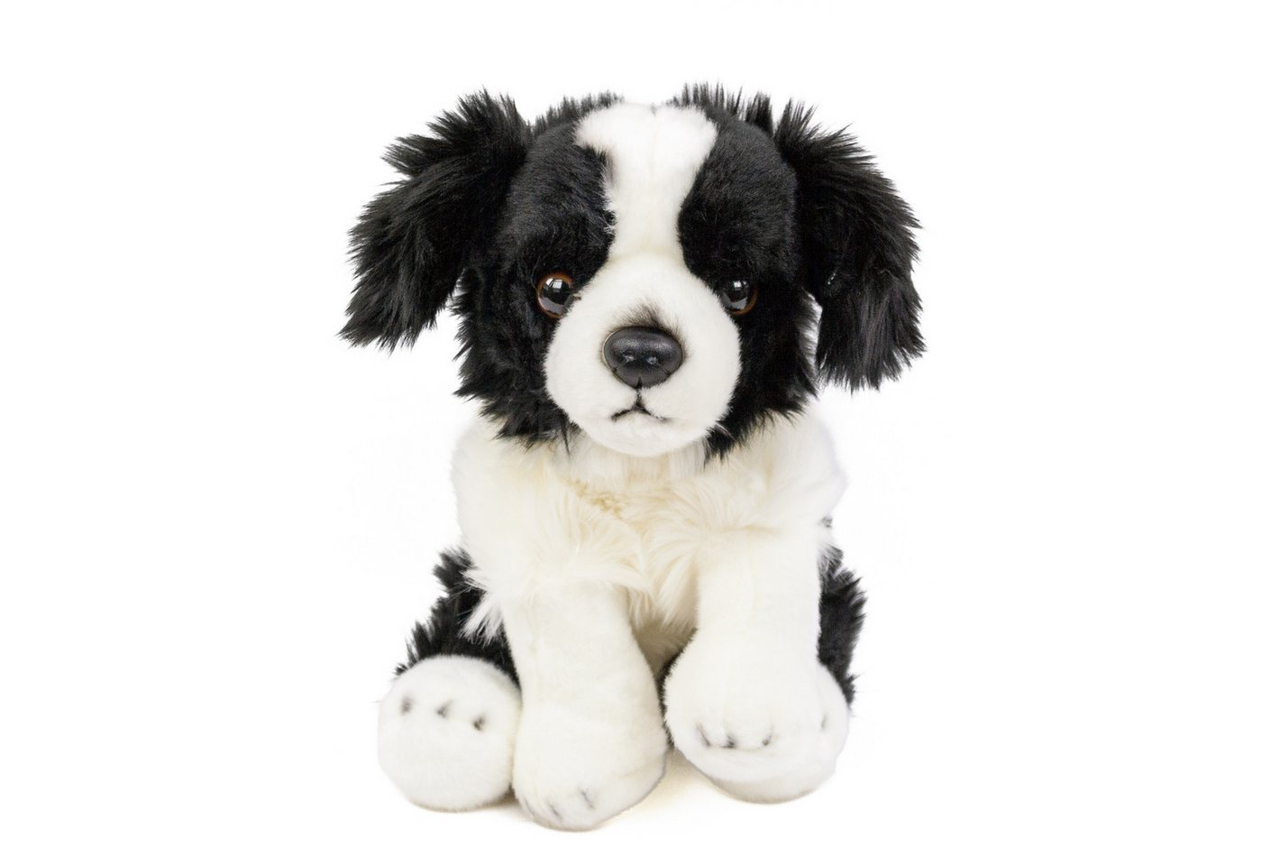 • Dieses Plüschtier in Form eines sitzenden Border Collie Hundes ist 30 cm groß und besteht aus kuschelweichem schwarz-weißem Plüsch