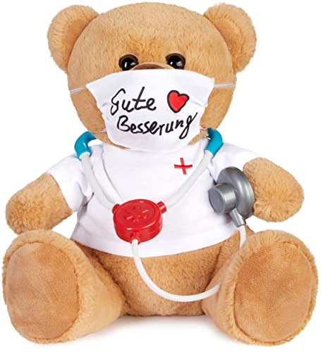 BRUBAKER Teddy Plüschbär mit Mundschutz und Stethoskop - Gute Besserung - 35 cm - Teddybär mit Arzt Shirt Weiß - Braun Hellbraun