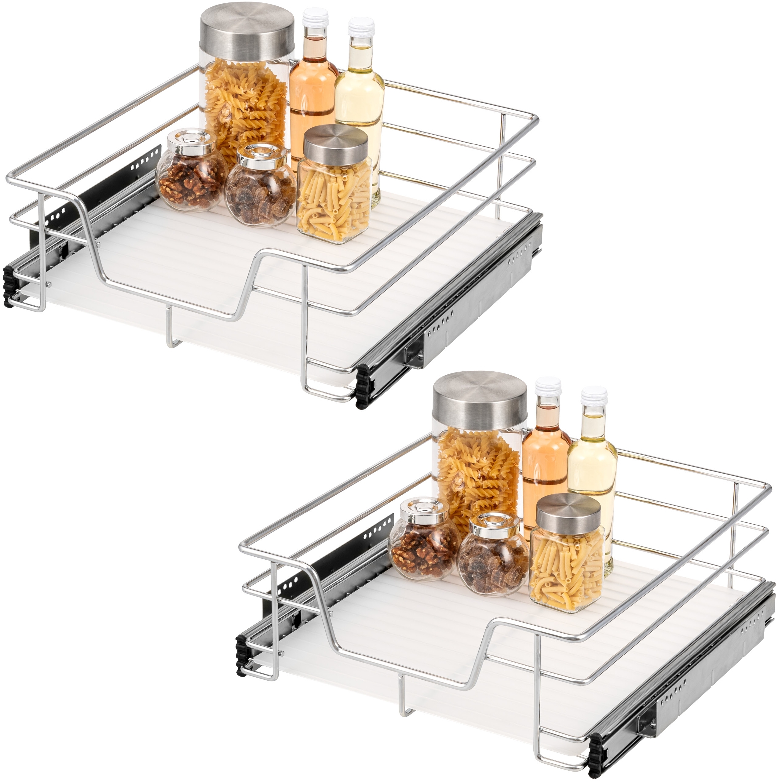 | Name | Teleskopschubladen 2er Set - für 50 cm Schrank mit Einlegeboden, aus Metall, (Chrom) |