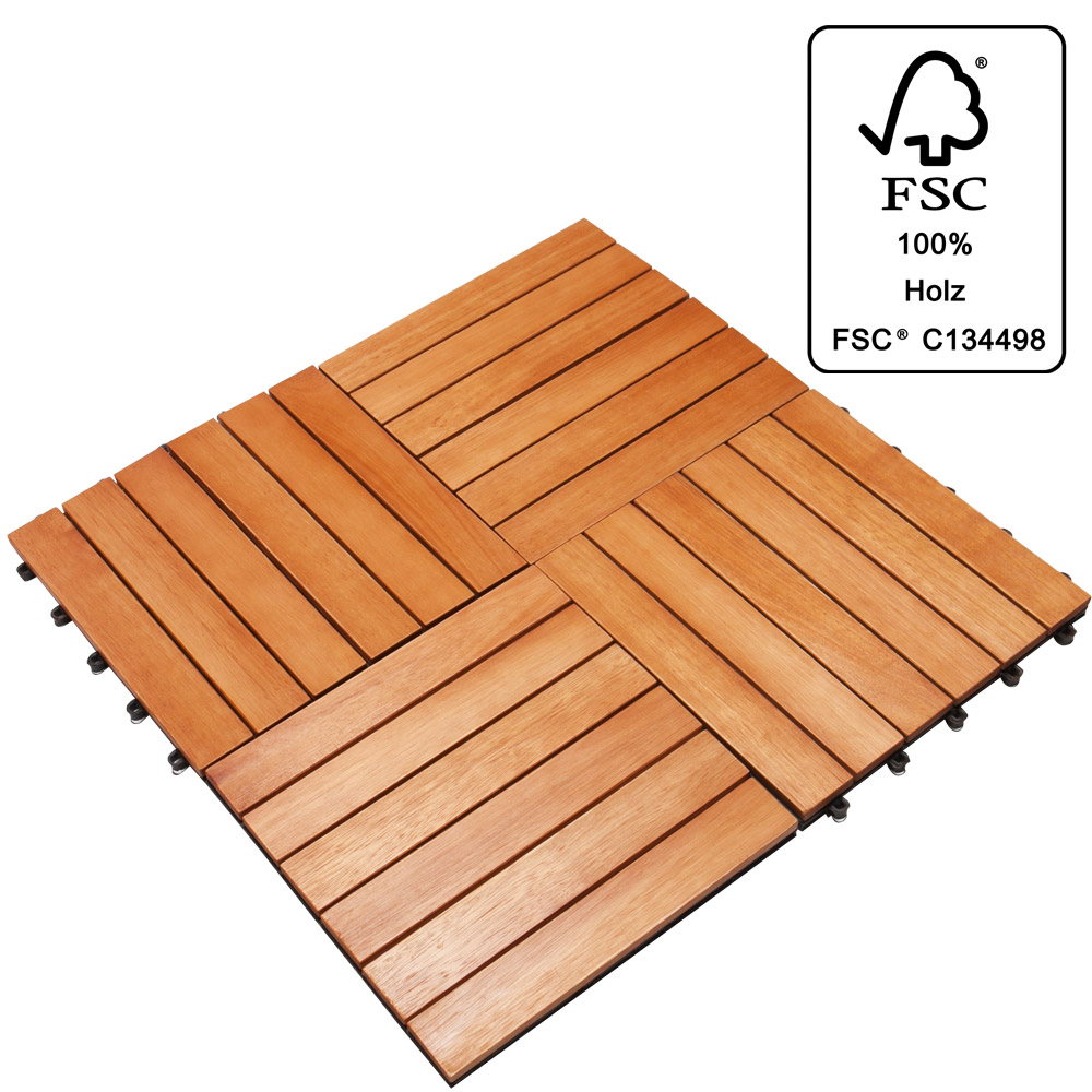 Die Holzfliesen aus Eukalyptusholz sind einfach zu verlegen und bieten eine ansprechende Optik. Sie sind leicht zu schneiden und haben eine wasserabweisende Kunststoffunterlage. Allerdings gibt es Berichte über unterschiedliche Qualitätsstandards und Probleme mit dem Kunststoffunterbau, der bei längerem Gebrauch zerbröseln kann. Zudem passt das Stecksystem nicht immer perfekt zusammen.