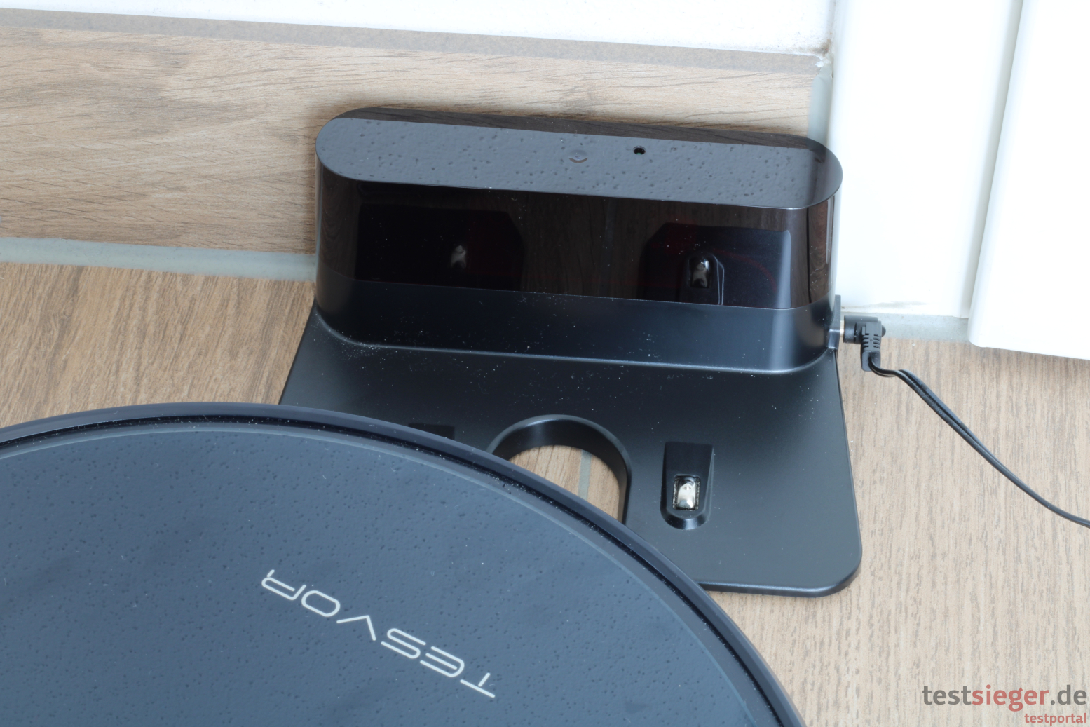 Den Weg zur Ladestation findet der S6 in der Regel souverän. Diese ist jedoch nicht optimal gestaltet. Da eine Kabelaufwicklung fehlt, liegt die überschüssige Strippe auf dem Boden und wird zum Hindernis für den Roboter. Als provisorische Lösung kann der Nutzer das Kabel um das Netzteil wickeln, optimal ist das aber natürlich nicht. Der Tesvor verfügt über ein integriertes Sprachmodul. Er informiert die Nutzer über die meisten Vorgänge, das Betriebsgeräusch übertönt den Roboter jedoch. Wer die Funktion nicht nutzen möchte, kann sie in der App deaktivieren.