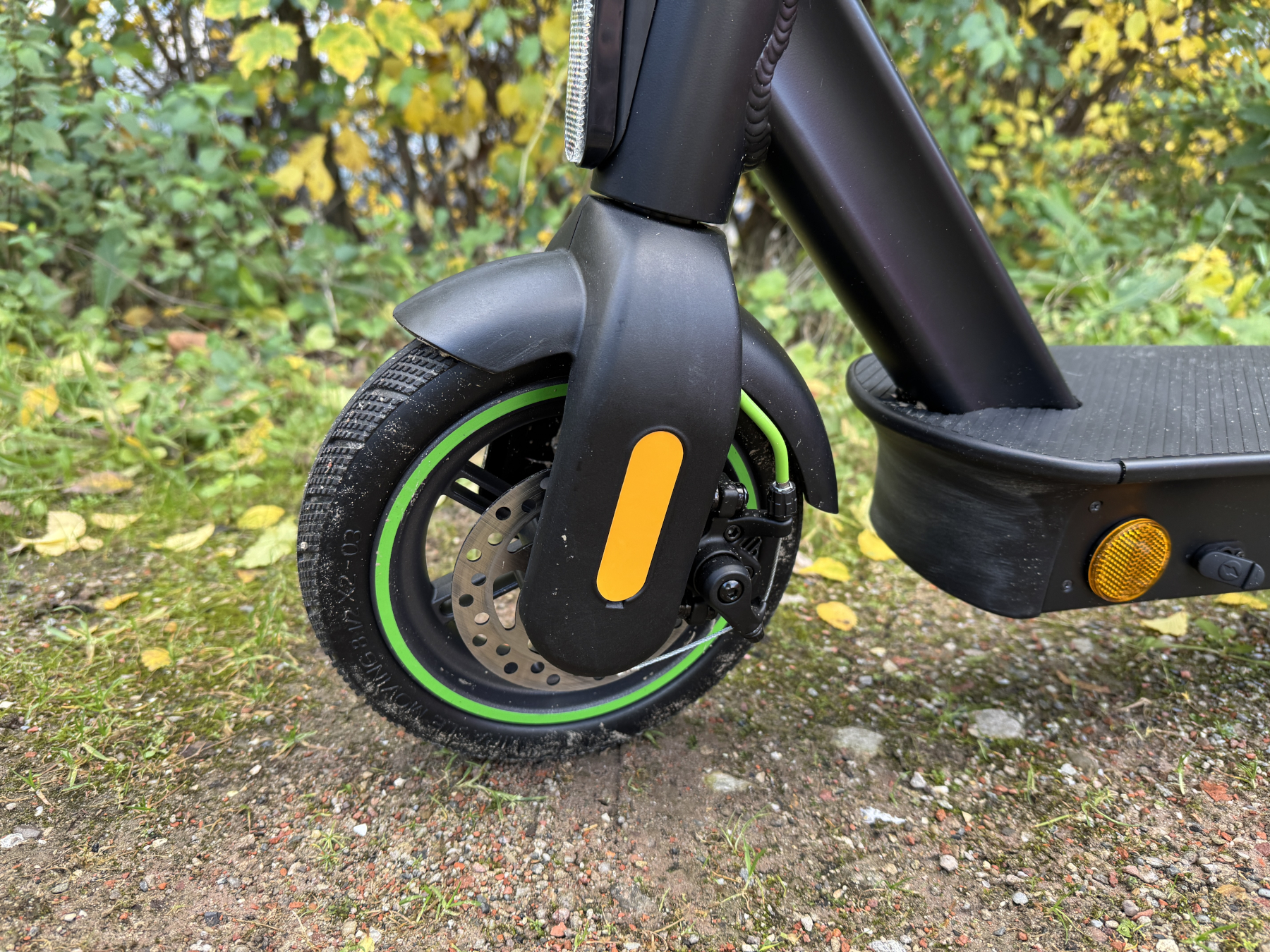 Die Bremsleistung des ES Series 3 ist sehr gut. Er kommt aus der Höchstgeschwindigkeit innerhalb von nur 1,7 Metern zum Stillstand – ein beeindruckender Wert. Hier macht sich die verbaute Scheibenbremse am Vorderrad bemerkbar. In dieser Preisklasse nicht selbstverständlich. Die Bremsverteilung ist dabei gut ausbalanciert; das Vorderrad blockiert kaum, und das Hinterrad bleibt stabil, ohne unangenehme Ausreißer zu zeigen. Auch bei Vollbremsungen bleibt der Scooter sicher auf dem Boden, ohne Gefahr, dass der Fahrer die Kontrolle verliert.