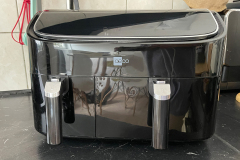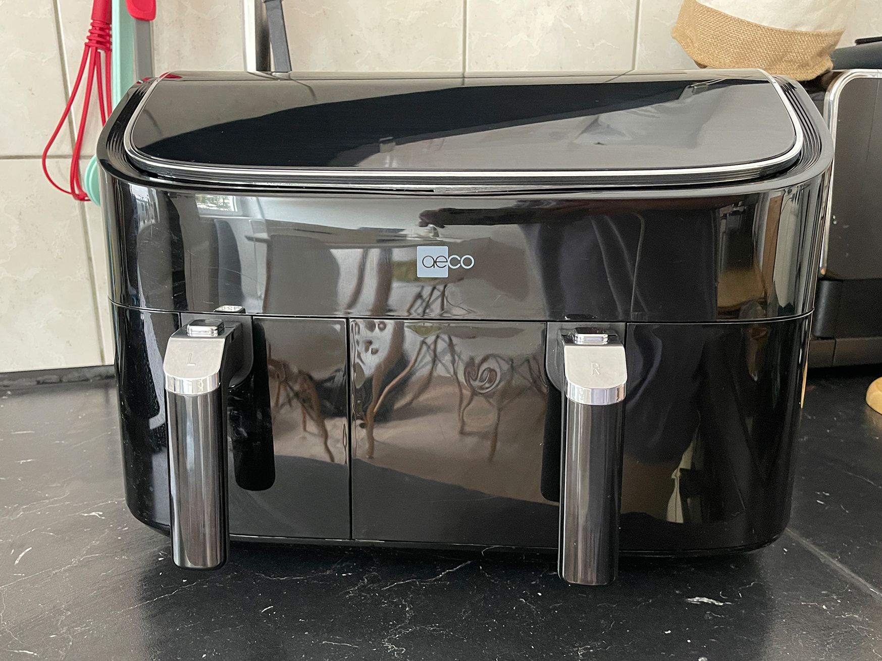 Die Zweikammer-Heißluftfritteuse aeco DUO überzeugt durch eine ansprechende Optik und modernes Design. Kleinere silberne Akzente an den Griffen ergänzen die Standardfarbe Schwarz stilvoll. Der Touchscreen auf der Oberseite punktet durch ein scharfes Bild und fügt sich nahtlos in das elegante Design ein. Allerdings zeigt die Touch-Oberfläche eine hohe Empfindlichkeit gegenüber Fingerabdrücken. Selbst ohne fettige Finger hinterlässt jede Berührung deutliche Spuren, was bei einem gut sichtbaren Küchengerät eher unpraktisch ist. Dies schmälert jedoch nicht den positiven Gesamteindruck.