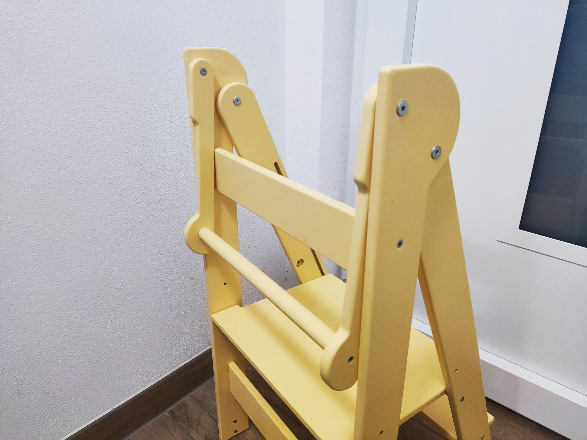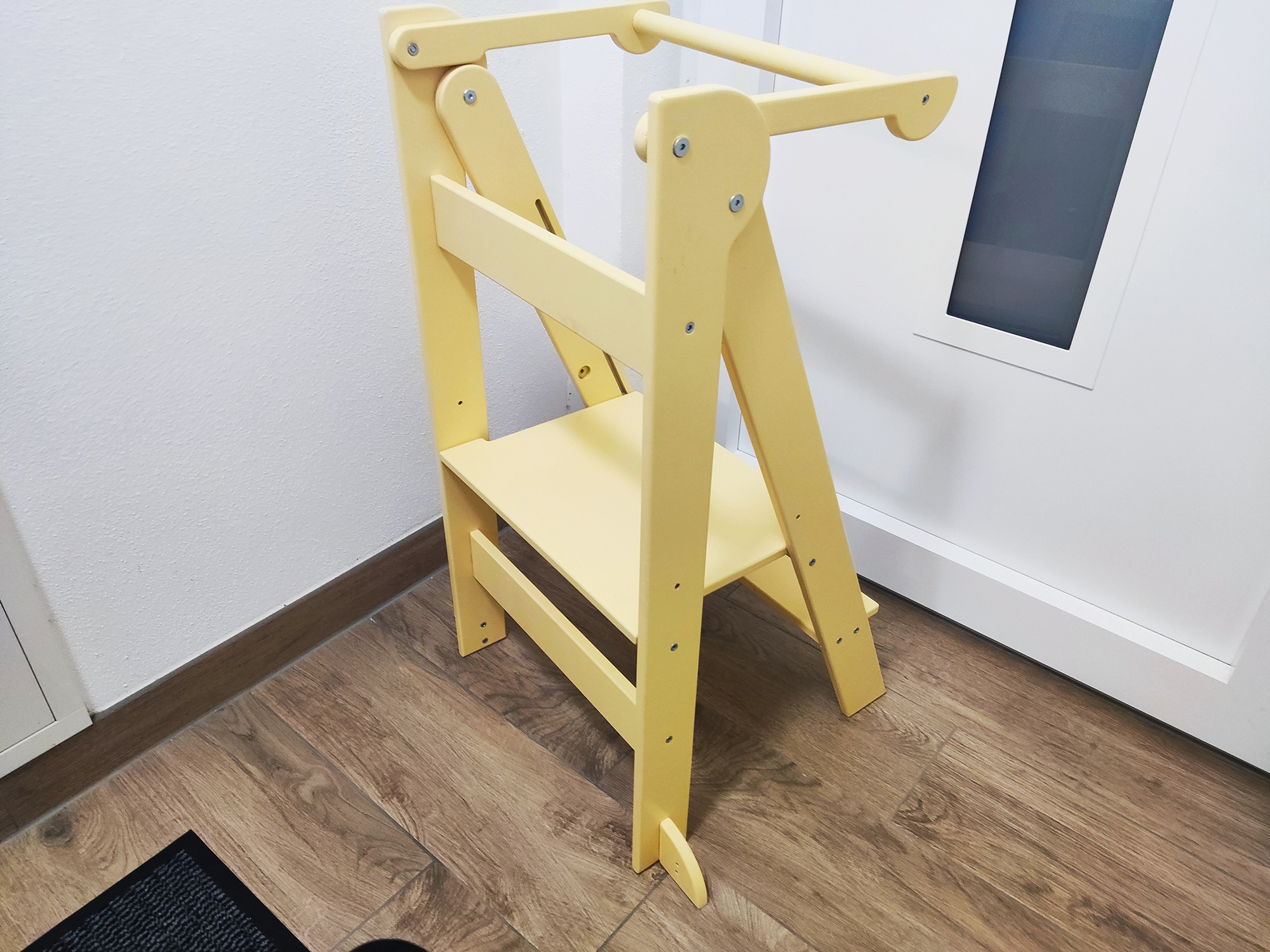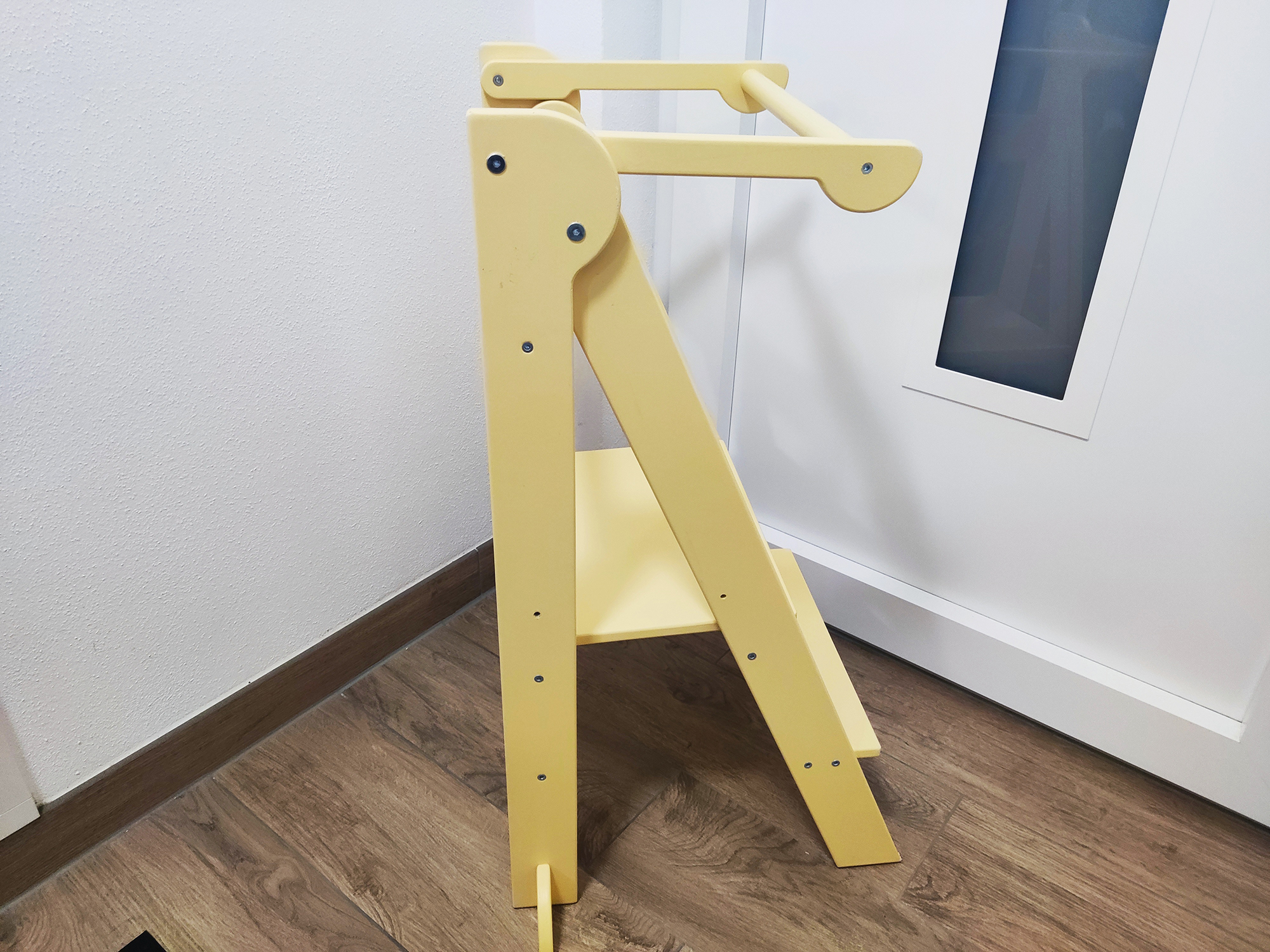 Das Design des Bellabino Tay ist in erster Linie durch die Funktionalität bestimmt. So verzichtet der Hersteller beispielsweise auf durchgängige Seitenwände, damit Nutzerinnen und Nutzer den Lernturm zusammenklappen können. Aber auch sonst finden sich keine Verzierungen oder Ähnliches. Dadurch sollte sich der Tay aber auch gut in verschiedene Wohnräume integrieren. Nutzerinnen und Nutzern steht eine breite Farbpalette zur Wahl. Bei Natur, Weiß, Weiß/Natur, Gelb und Minzgrün sollten alle fündig werden. Uns steht für den Test die gelbe Farbvariante zur Verfügung. Ausgeklappt misst der Bellabino Tay 60 Zentimeter in der Breite, 88 Zentimeter in der Höhe und 47 Zentimeter in der Tiefe. Damit hat er normale Abmessungen für einen Lernturm. Dank des Klappmechanismus lässt er sich bei Nichtgebrauch gut verstauen. Dann müssen Nutzerinnen und Nutzer 60 x 97,5 x 19 Zentimeter (Breite x Höhe x Tiefe) an Platz einrechnen. Mit einem Gewicht von circa 6 Kilogramm gehört der Turm zu den leichteren Vertretern.