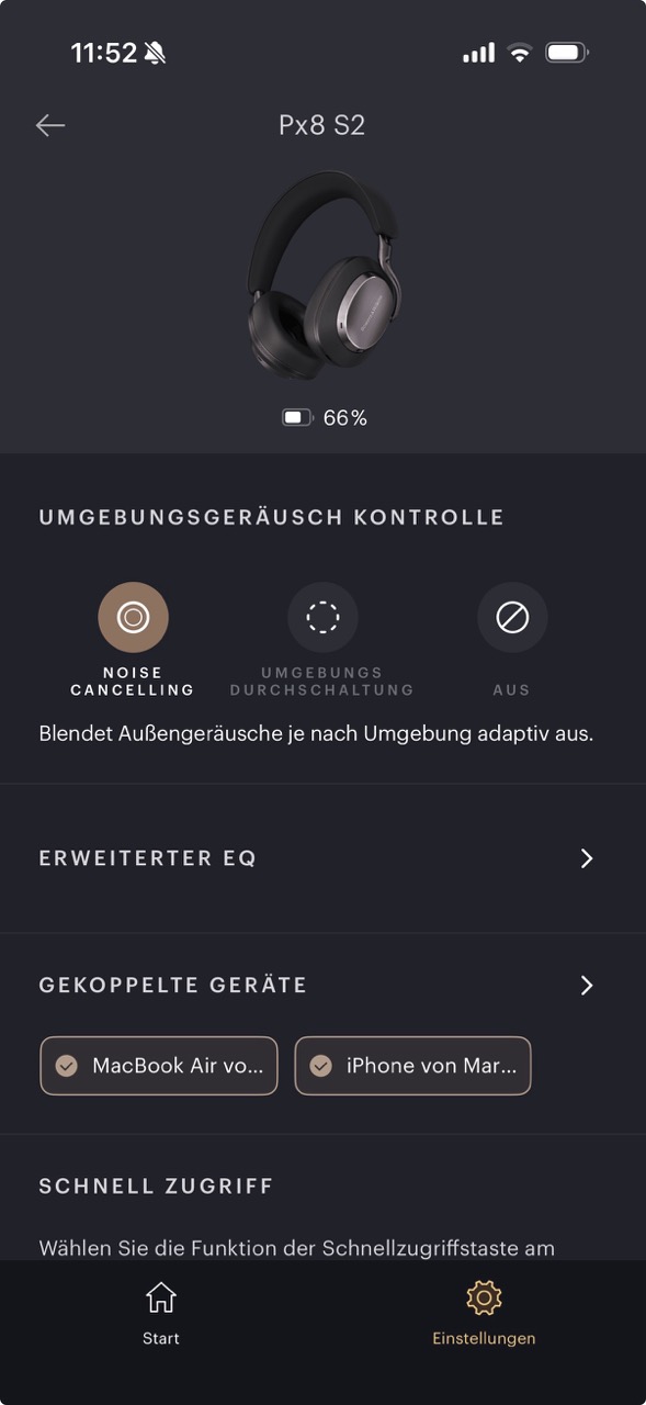 Screenshot der Bowers & Wilkins Music App mit Optionen für Noise Cancelling, Umgebungsdurchschaltung und Aus.