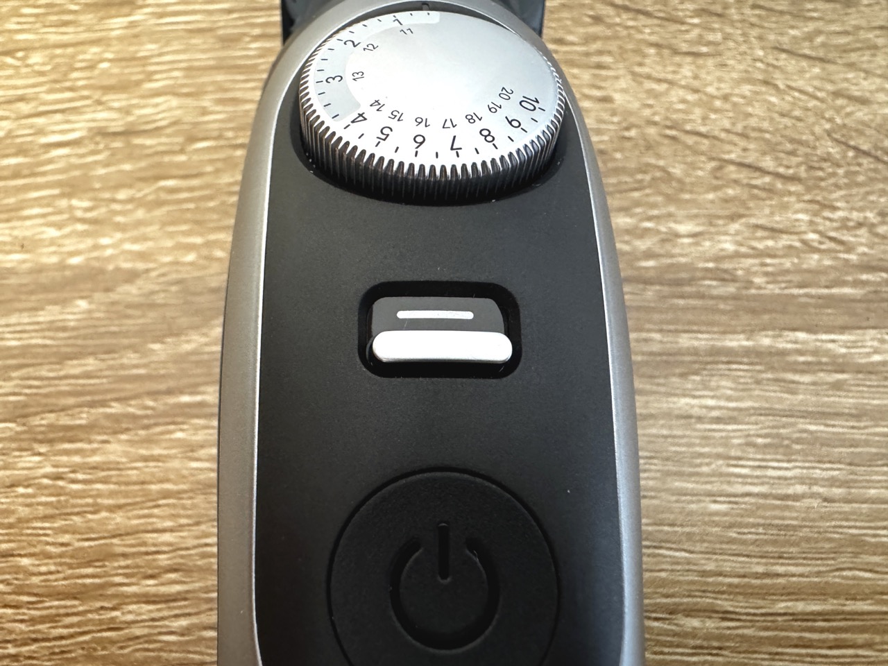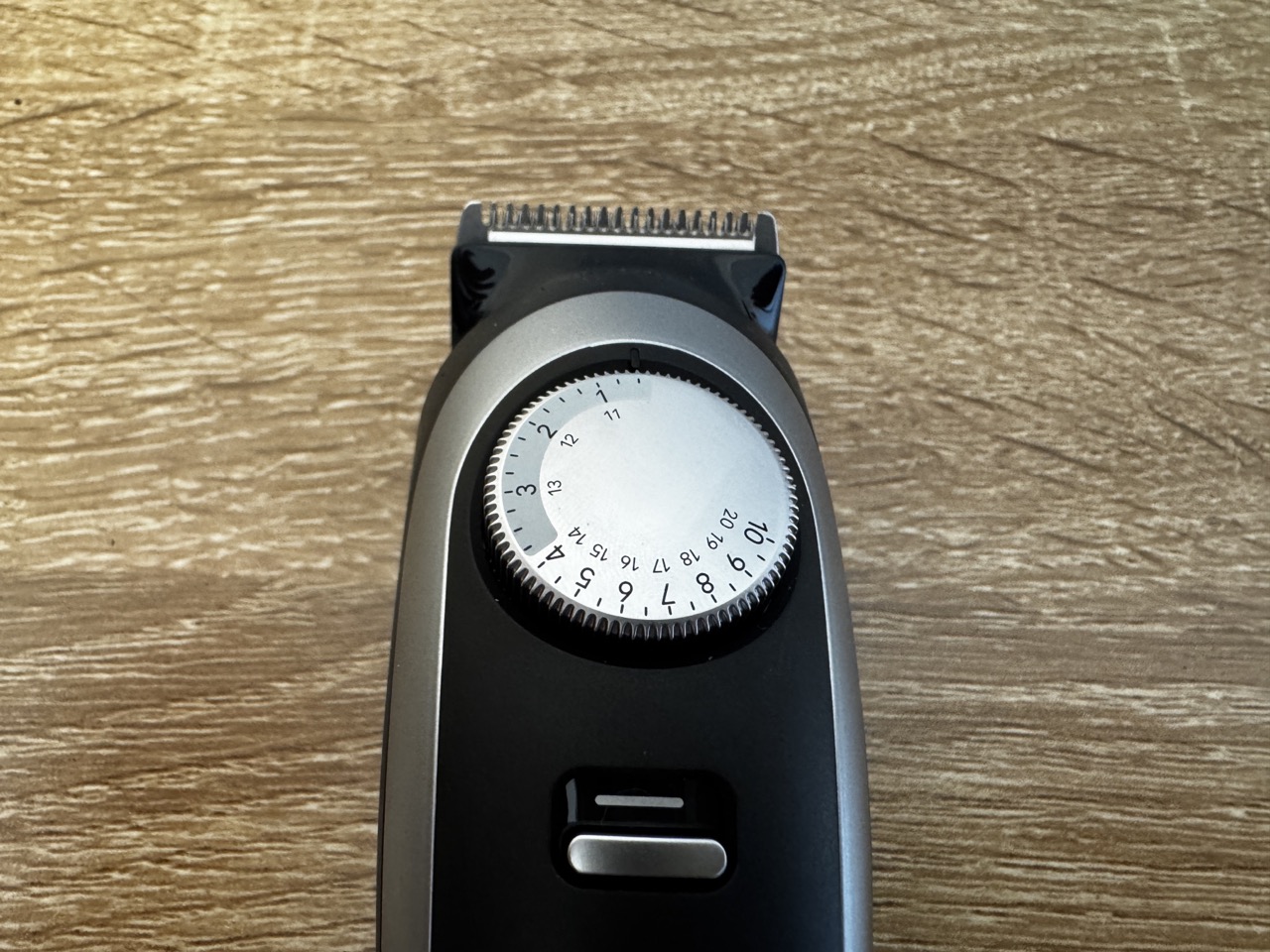 Die Einstellung der Länge des Bartes können wir über ein Drehrad über dem Power-Button festlegen. Er ermöglicht zwischen einem und 20 Millimetern mehr als 50 Einstellungsmöglichkeiten – sehr gut. Mehr als für den Privatgebrauch notwendig. Über eine Feststelltaste können wir die Länge während der Rasur arretieren, sodass eine gleichmäßige Länge möglich ist.