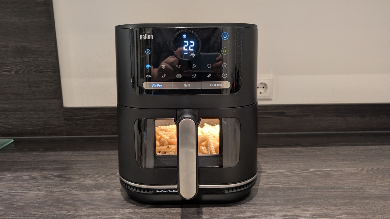 Bei der Braun MultiFry 5 handelt es sich um ein ausgesprochen vielseitiges Gerät: Drei Hauptmodi stehen bereit – Air Fry, Grill und Fast Oven. Diese verzweigen sich in weitere Funktionen. Laut Hersteller soll die RealOven-Technologie dabei den Unterschied machen: Zwei Heizelemente oberhalb und unterhalb des Garkorbs sowie ein leistungsstarker Ventilator verteilen die Hitze gleichmäßiger und sollen schneller knusprige Ergebnisse ermöglichen, ohne dass ein Vorheizen nötig ist. Diese 3-in-1-Ausrichtung ergänzt die Praxis sinnvoll, weil sich damit nicht nur klassische Pommes frites, sondern auch Grillgut und Backwaren abdecken lassen.