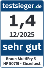 Die Braun MultiFry 5 überzeugt im Praxistest mit einem „sehr guten“ Ergebnis. Die Verarbeitung wirkt stabil, das Design bleibt trotz 6,0 Liter Garkorb alltagstauglich, und die Standfestigkeit überzeugt. In der Bedienung zeigt die Programmvielfalt zunächst eine Einstiegshürde, die bildbasierte Anleitung hilft dabei nur begrenzt. Sobald die Logik sitzt, profitieren wir vom durchdachten Drehrad-Display, der manuellen Temperatur bis 220 Grad Celsius und dem Sichtfenster mit Licht. Entscheidend sind die Ergebnisse: Pommes frites gelingen schnell und sehr knusprig, frische Pommes frites stechen mit cremigem Kern heraus, und der Grillmodus liefert rundum krosse Panaden. Der Stromverbrauch bleibt dabei auf einem niedrigen Niveau und die Reinigung geht einfach von der Hand. Von uns gibt es eine klare Kaufempfehlung.