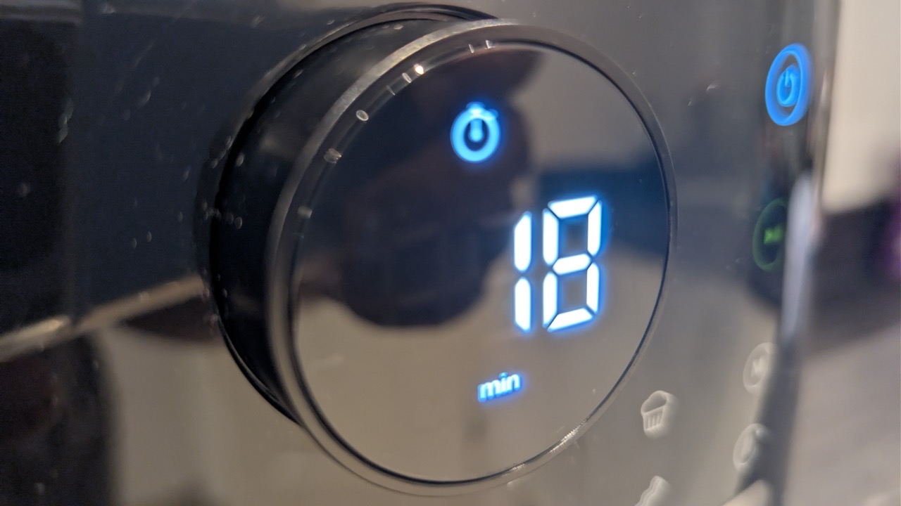 Sehr gelungen ist das zentrale Drehrad mit integriertem Display. Es verbindet die Einstellung von Zeit und Temperatur mit direkter Rückmeldung zur verbleibenden Dauer und den aktiven Parametern. Die Temperatur lässt sich manuell von 80 bis 220 Grad Celsius wählen – sehr schön. Die Tasten reagieren zügig, der Garkorb lässt sich bequem mit einer Hand herausnehmen und rastet sauber wieder ein. Laut Hersteller besteht der Korb aus einer PFAS-freien Keramikbeschichtung, die laut Hersteller ohne schädliche Chemikalien hergestellt.