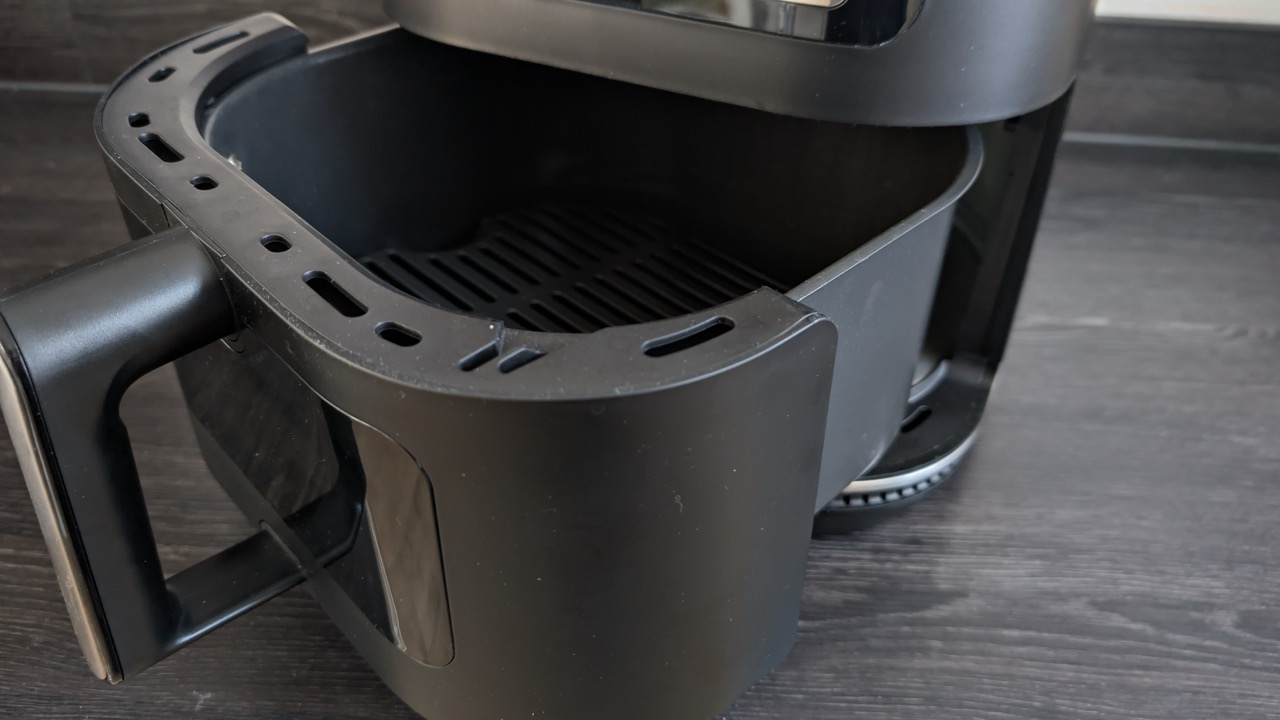 In der Praxis überzeugt das Gehäuse durch eine sehr stabile Anmutung. Der verwendete Kunststoff fühlt sich hochwertig an und gibt bei Druck nicht nach, was das Vertrauen in die Langlebigkeit stärkt. Positiv fällt außerdem auf, dass keine Produktionsrückstände sichtbar sind und keine scharfen Kanten stören. Das Gerät steht sehr sicher, was gerade beim Herausziehen des Garkorbs ein relevanter Punkt für die Alltagssicherheit ist.