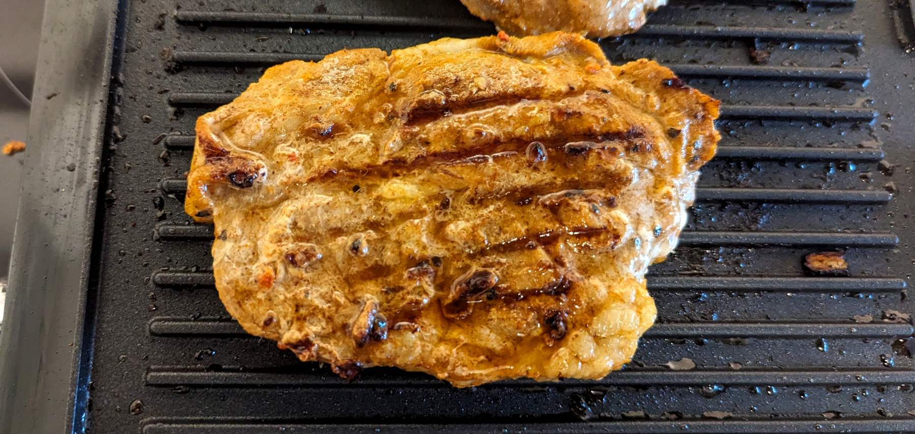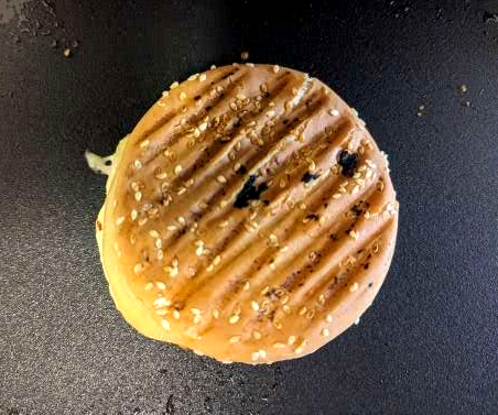 Im zweiten Durchgang nutzen wir den Kontaktgrill im Ofen-Modus. Dazu belegen wir einen Burger mit einem Patty, Käse und verschiedenen Saucen. Gemäß der Bedienungsanleitung braten wir den Burger auf mittlerer Stufe für 5 Minuten. Das Ergebnis kann sich mehr als sehen lassen. Das Brötchen ist auf der kompletten Oberfläche gleichmäßig gebräunt Dies spricht für eine sehr gleichmäßige indirekte Hitzeverteilung. Zuletzt testen wir den geöffneten Modus, in dem uns beide Platten als große Grillfläche dienen. Auf der geriffelten Grillfläche bereiten wir Nackensteaks auf voller Temperatur zu. Auf der ebenen Grillfläche bereiten wir 2 Spiegeleier zu, ebenfalls auf maximaler Temperaturstufe. Bereits nach wenigen Minuten sind sowohl die Spiegeleier als auch die Nackensteaks sehr gut zubereitet und nicht zu trocken. Insbesondere das Fleisch weist klare Grillstreifen auf, was uns sehr gut gefällt.