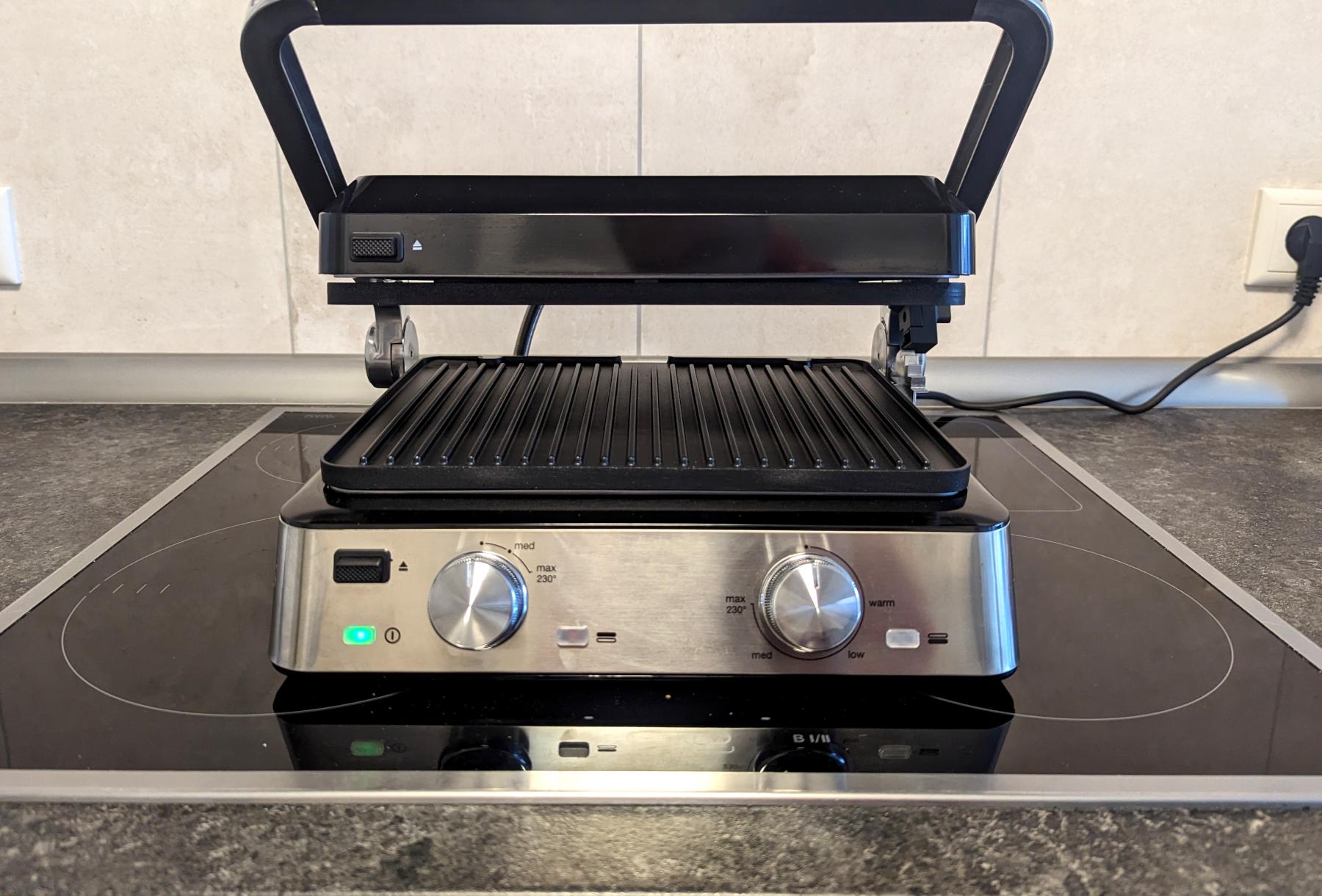 Die Bedienung erfolgt über 2 drehempfindliche Regler wie an einem Backofen oder einem Herd. Über diese stellen wir die Temperatur in 4 Stufen bis zu 230 Grad Celsius ein. 2 Kontrolllampen auf der Vorderseite bestätigen, wenn die gewünschte Temperatur erreicht ist. Die Einstellungen funktionieren in der Praxis gut und auch die einzelnen Tasten sitzen fest am Gerät – sehr gut. So ist die Handhabung einfach und stellt uns vor keine Probleme. Außer den genannten Elementen gibt es an der Ober- und Unterseite des Grills noch zwei Klipp-Tasten, mit denen wir die Grillplatten einfach lösen und bei Bedarf reinigen können. Dies klappt in unserem Test sehr einfach.
