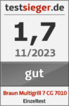 Der Braun Multigrill 7 CG 7010 zeigt sich in unserem Test als vielseitiger und gut verarbeiteter Kontaktgrill. Mit seinen drei Garpositionen ermöglicht er maximale Flexibilität bei der Zubereitung. Die Handhabung gestaltet sich einfach. In Bezug auf die Ergebnisse erweist sich das Gerät als leistungsstark und vielseitig einsetzbar, wobei die Hitzeverteilung beim Toasten von Brot etwas ungleichmäßig ist. Insgesamt bietet der Braun Multigrill 7 CG 7010 eine solide Leistung und bekommt von uns eine Kaufempfehlung.