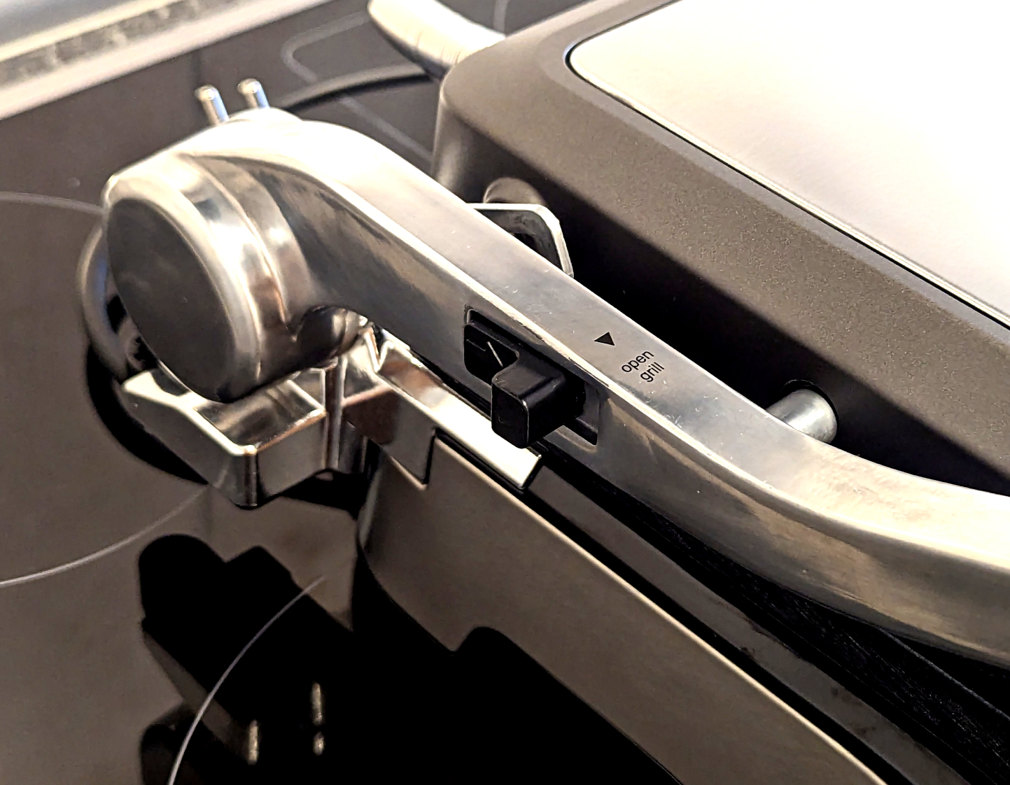 Neben den erwähnten Elementen gibt es an der rechten Seite der oberen und unteren Platte jeweils einen Klipp-Schalter, über den wir die jeweiligen Platten abnehmen können. Dies funktioniert einfach und reibungslos. Die restliche Bedienung ist ebenfalls gelungen. Über den verbauten Griff können wir den Multigtrill angenehm öffnen und schließen. Auch der Abstand der beiden Platten zueinander lässt sich gut über den verbauten Schieberegler regeln. Dies ist besonders bei dickem Grillgut wichtig.