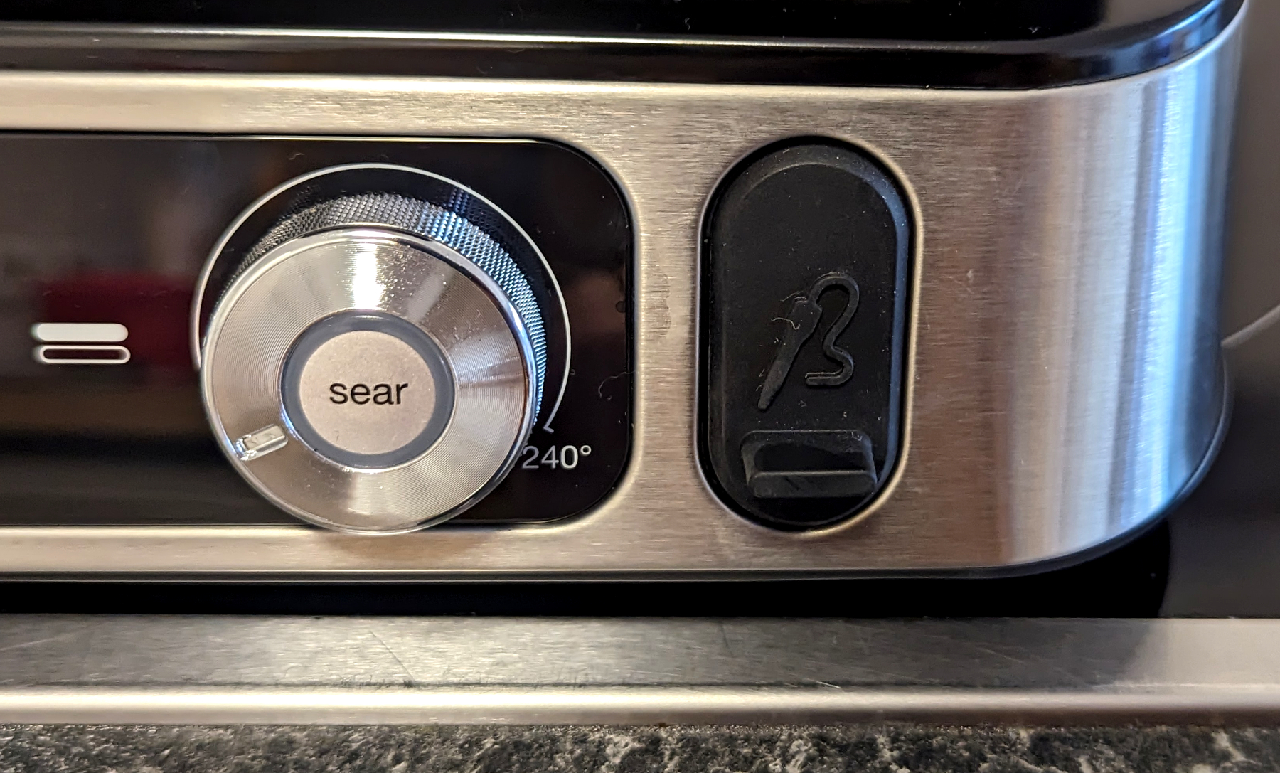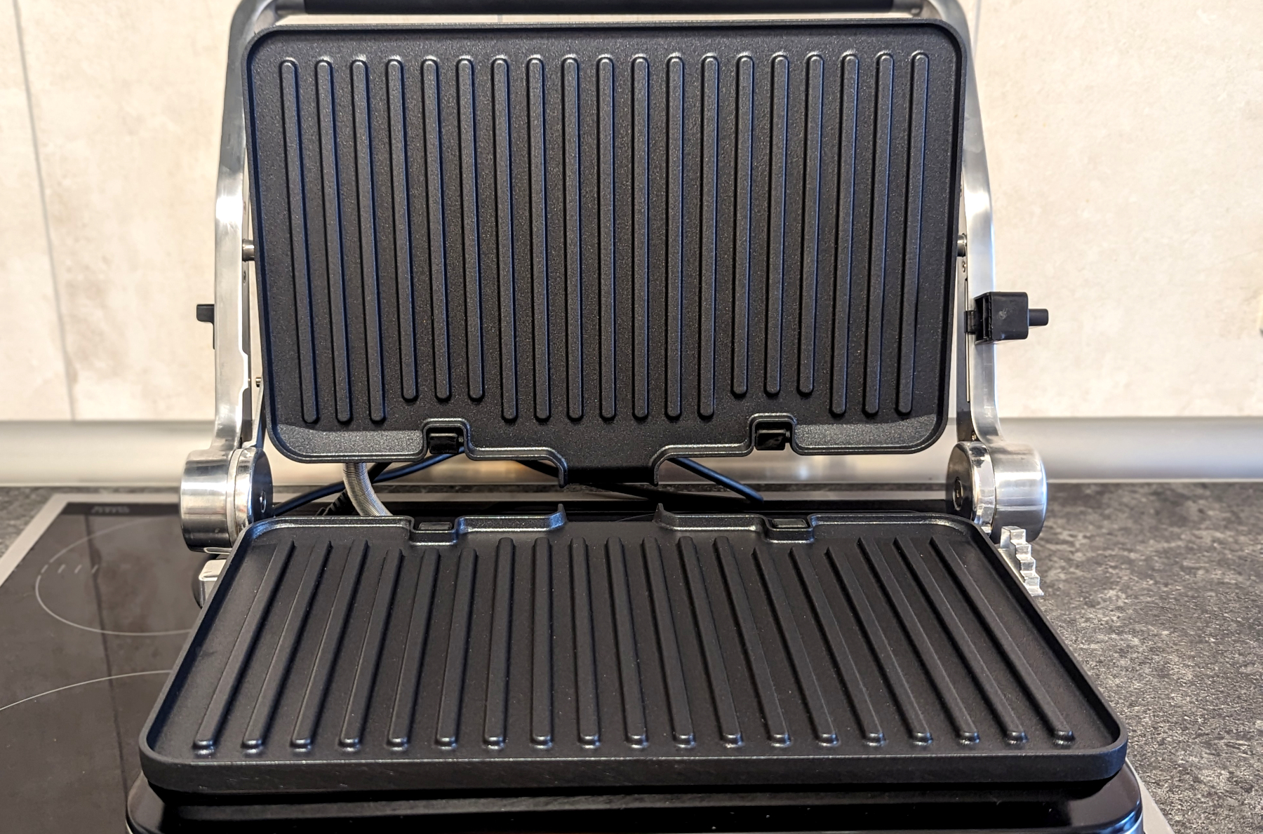 Die Bedienung erfolgt über 2 Drehregler sowie das integrierte Display. Die Drehregler steuern die Temperatur der oberen und unteren Kontaktfläche separat. Sie lassen sich stufenlos bis auf 240 Grad Celsius einstellen. Wem dies nicht genug ist, kann über einen Knopfdruck auf die Drehregler die Maximaltemperatur auf 265 Grad Celsius erhöhen. Dies ist jedoch nur für kurzes und scharfes Anbraten zum Beispiel bei Steaks gedacht. Das Display gibt Nutzerinnen und Nutzern Informationen über die aktuelle Temperatureinstellung auf beiden Platten und teilt uns mit, ob die Kontaktflächen betriebsbereit sind.