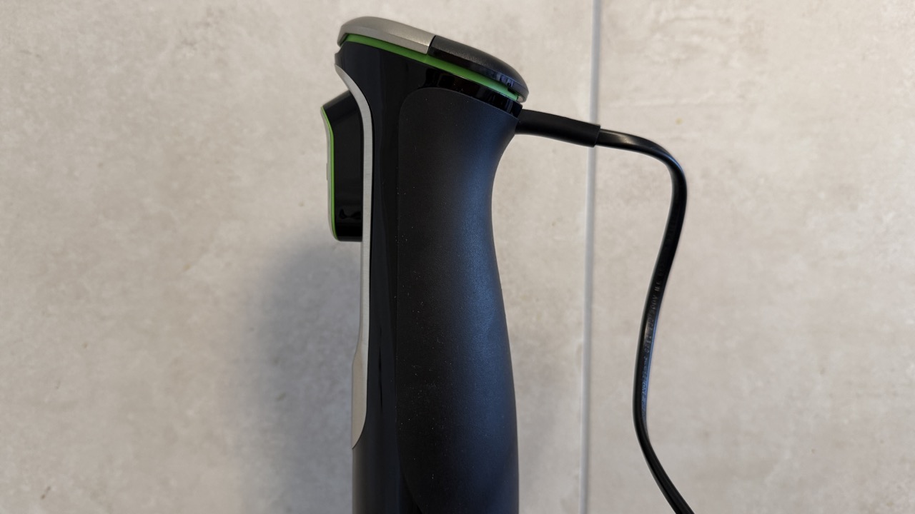 Wir befestigen die Aufsätze mit einem praktischen Klickmechanismus, sodass wir die Handeinheit leicht vom Pürierstab trennen und andere Aufsätze anbringen können. Das geht schnell und gibt ein sicheres Gefühl. Auch die Ergonomie ist überzeugend: Der Griff ist so geformt, dass er gut in der Hand liegt und einen sicheren Halt bietet.