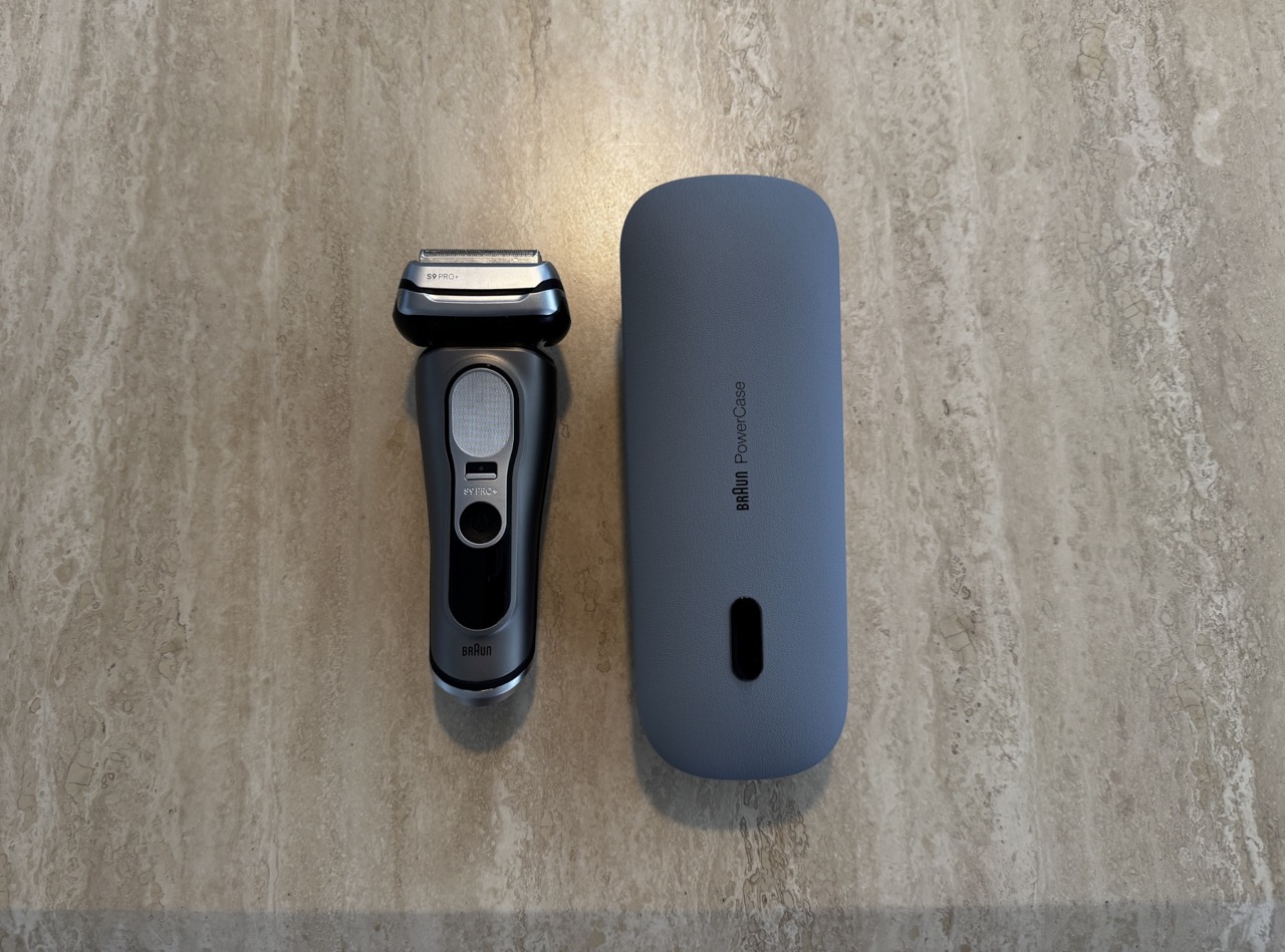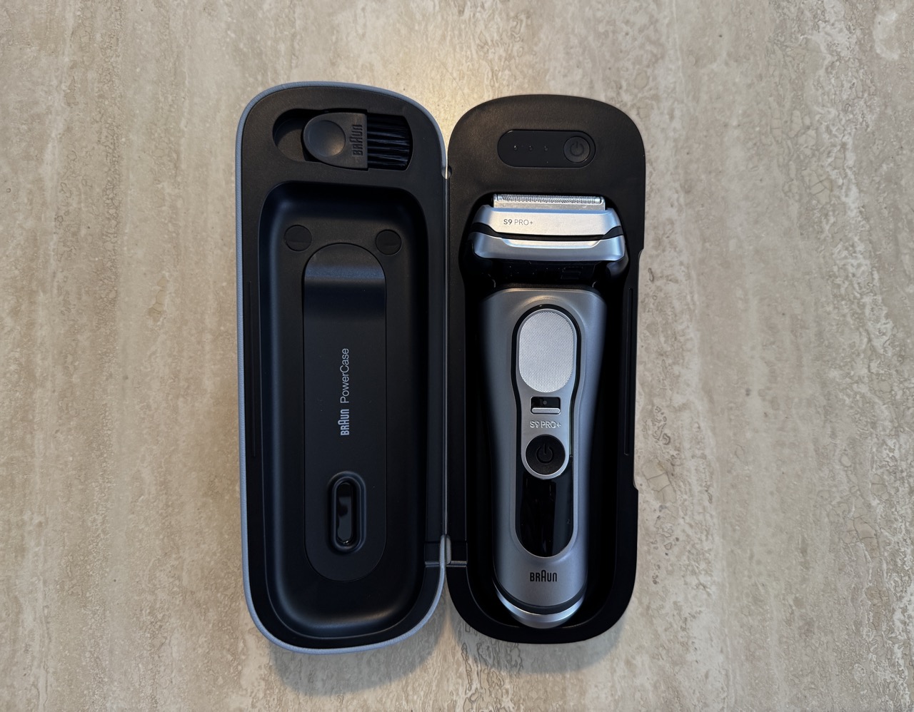Der Lieferumfang ist üppig: Neben der Reinigungsstation mit Reinigungslösung gibt es ein Netzteil mit proprietärem Anschluss, eine Reinigungsbürste, ein Reiseetui sowie einen auf der Rückseite integrierten Trimmeraufsatz. Das Reiseetui lässt sich nicht nur zur Aufbewahrung nutzen, sondern auch zum Laden des Rasierers – dank integriertem Akku funktioniert es sogar als Powerbank. Ein Feature, das es so beim Vorgänger nicht gab. Damit ist der Rasierer auch ohne Station mobil einsetzbar. Wer bereits einen Series 8 oder 9 Rasierer besitzt, kann das Case auch separat erwerben. Einziger Kritikpunkt bleibt der Ladeanschluss. Hier verzichtet Braun auf einen universellen USB-C-Ports.