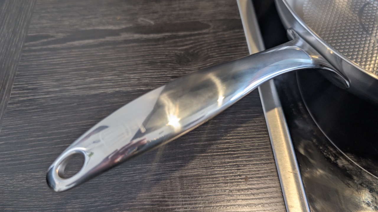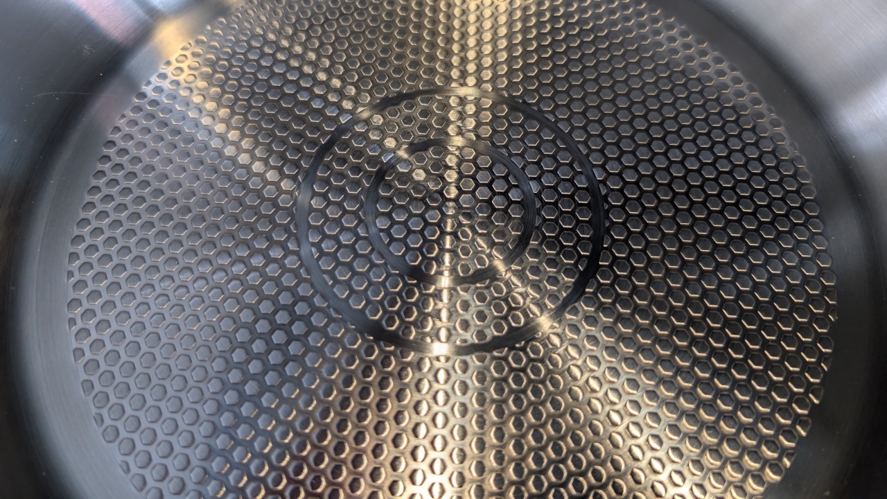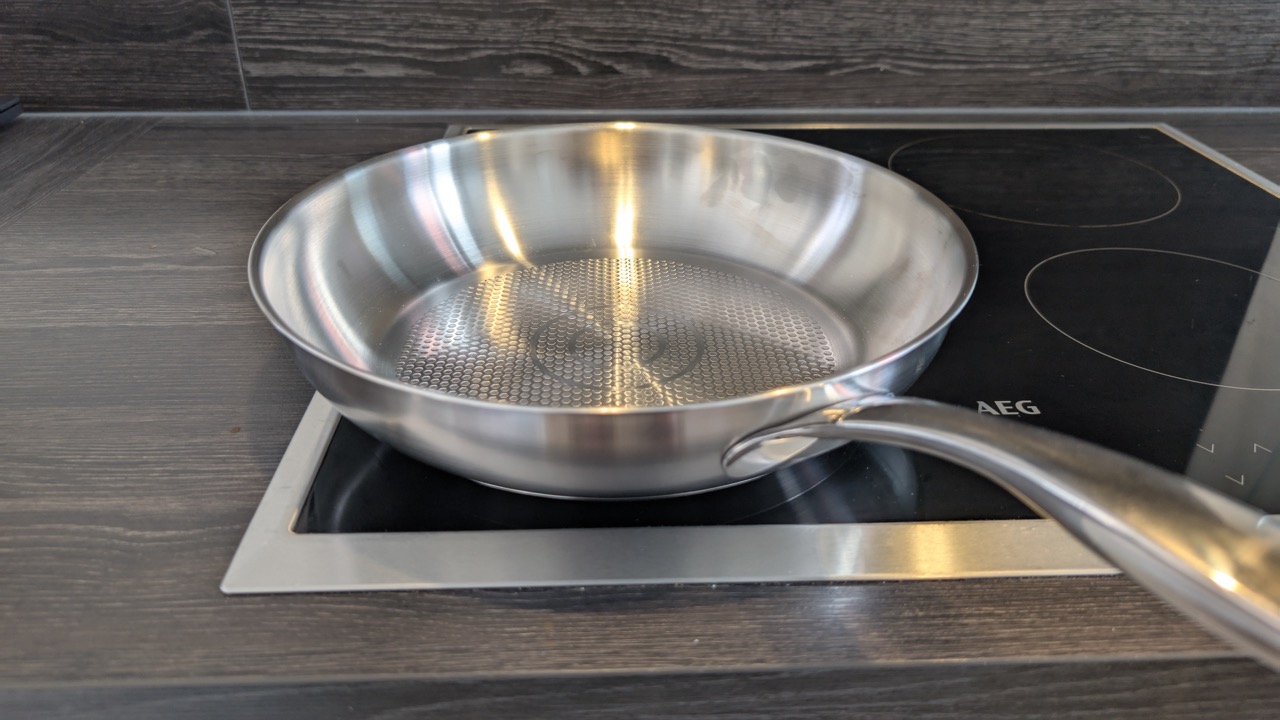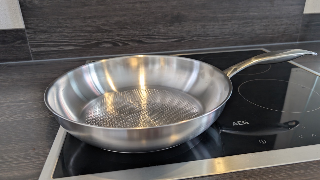 Da Edelstahlpfannen jedoch keine Antihaftbeschichtung haben, wird es bei empfindlicheren Produkten wie Ei oder feingliedrigem Gemüse schwieriger. Vegane Hähnchenalternativen haften bei zu hoher Hitze beispielsweise trotz reichlicher Ölzugabe derart stark am Pfannenboden, dass wir den Garprozess im Test abbrechen. Hier müssen wir für ein überzeugendes Ergebnis sehr vorsichtig mit der Hitze umgehen.