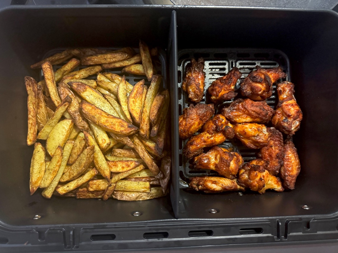 Das Zwei Zonen Konzept ist flexibel und praktisch für paralleles Garen, beim Schütteln wird es mit geteiltem Korb aber schnell schwierig. (Foto: Testsieger.de).