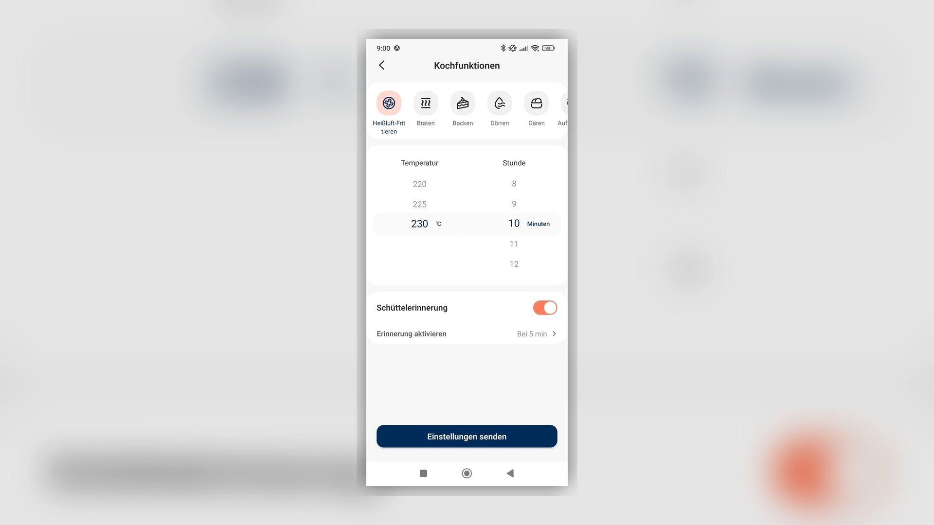 | Garprogramme | 6: Air Fry, Braten, Aufwärmen, Backen, Trocknen, Gären |