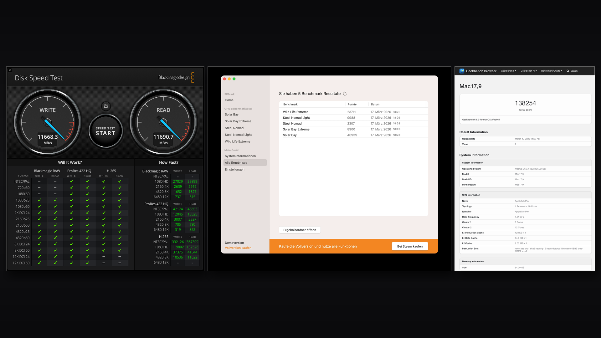 Beim 16″ MacBook Pro mit M3 Pro Chip sticht insbesondere die Effizienz des Geräts hervor. Der M3 Pro Prozessor liefert eine Leistung, die mit dem M2 Pro vergleichbar ist, aber mit einer höheren Energieeffizienz. Dies macht sich auch in einer deutlich besseren Akkulaufzeit bei Videowiedergaben bemerkbar. Das getestete Modell gibt es bei uns ab 2.500 Euro.