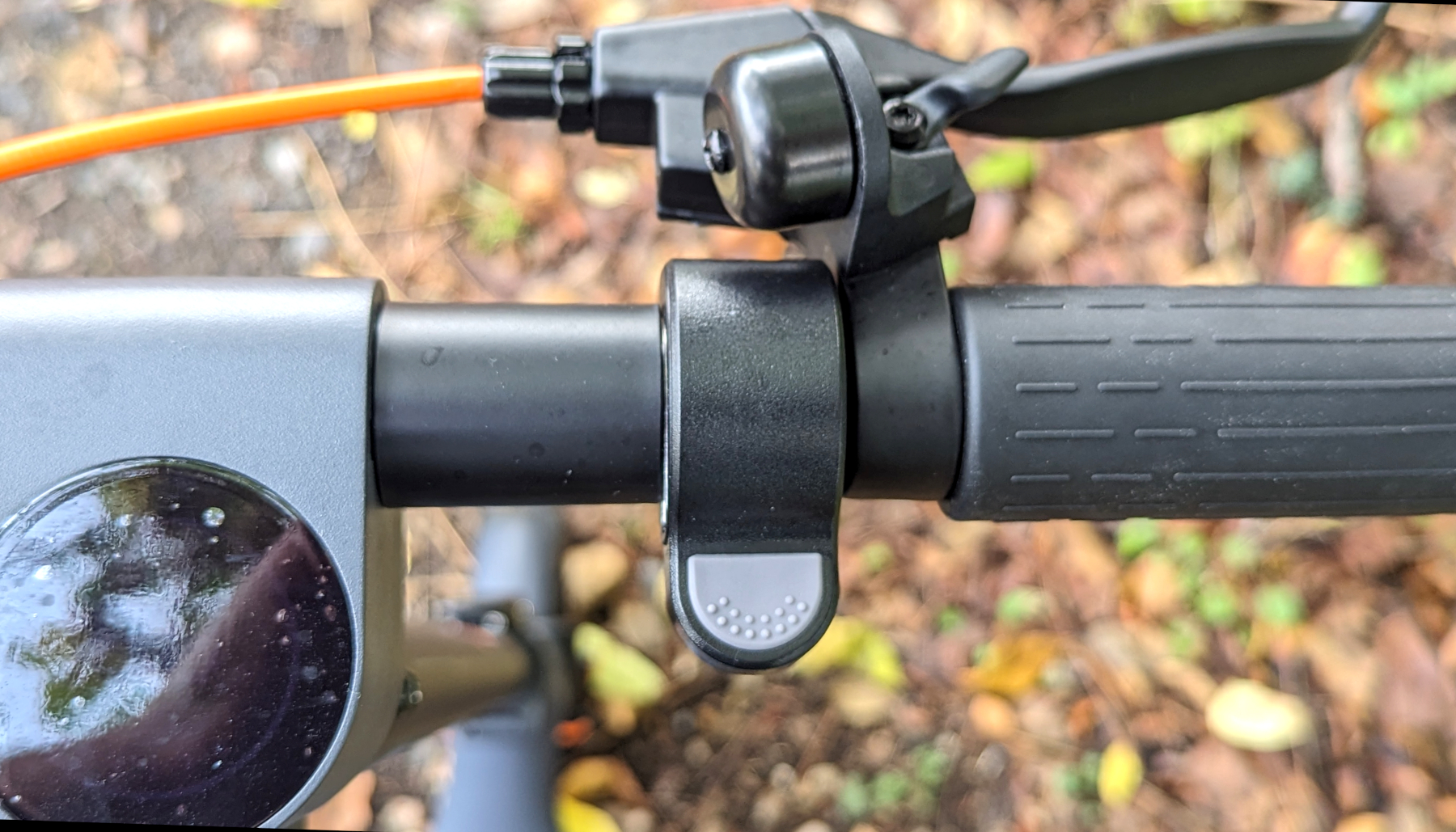 Direkt am Lenkrad ist der Bremshebel sowie eine Bremstaste zur Steuerung von Vorder- und Hinterradbremse. Oberhalb des Bremshebels befindet sich die Klingel. Die Beschleunigungstaste ist in direkter Nähe. Damit sind alle Bedienelemente in einem engen und gut zu erreichenden Abstand zueinander platziert. Dies ist besonders in gefährlichen Verkehrssituationen wichtig. Kritikpunkt ist aus unserer Sicht die Beschleunigungstaste. Da wir diese für die Fortbewegung konstant drücken müssen, ermüden unsere Finger bereits nach 10 bis 15 Minuten. Eine bessere Gummierung würde dies deutlich verzögern.