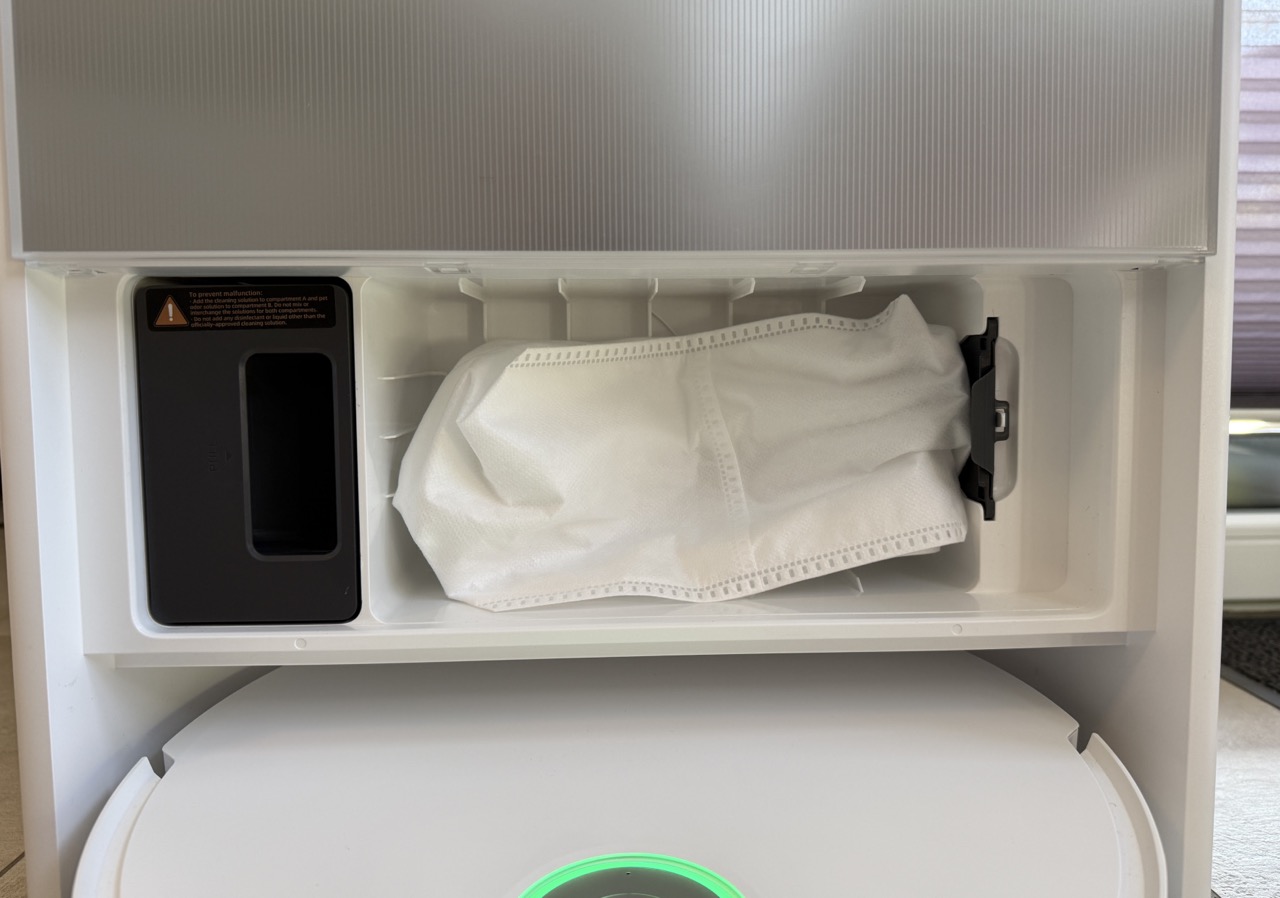 Die Station übernimmt nahezu alle Wartungsschritte automatisch: Sie entleert den Staubbehälter, wäscht und trocknet den Mopp, füllt Frischwasser nach und dosiert das Reinigungsmittel selbstständig. Im Alltag bleibt der Aufwand gering. Nutzerinnen und Nutzer müssen lediglich den Frischwassertank nachfüllen und den Schmutzwassertank entleeren. Einmal pro Woche empfiehlt sich ein kurzes Auswischen der Moppwanne – mehr ist nicht nötig.