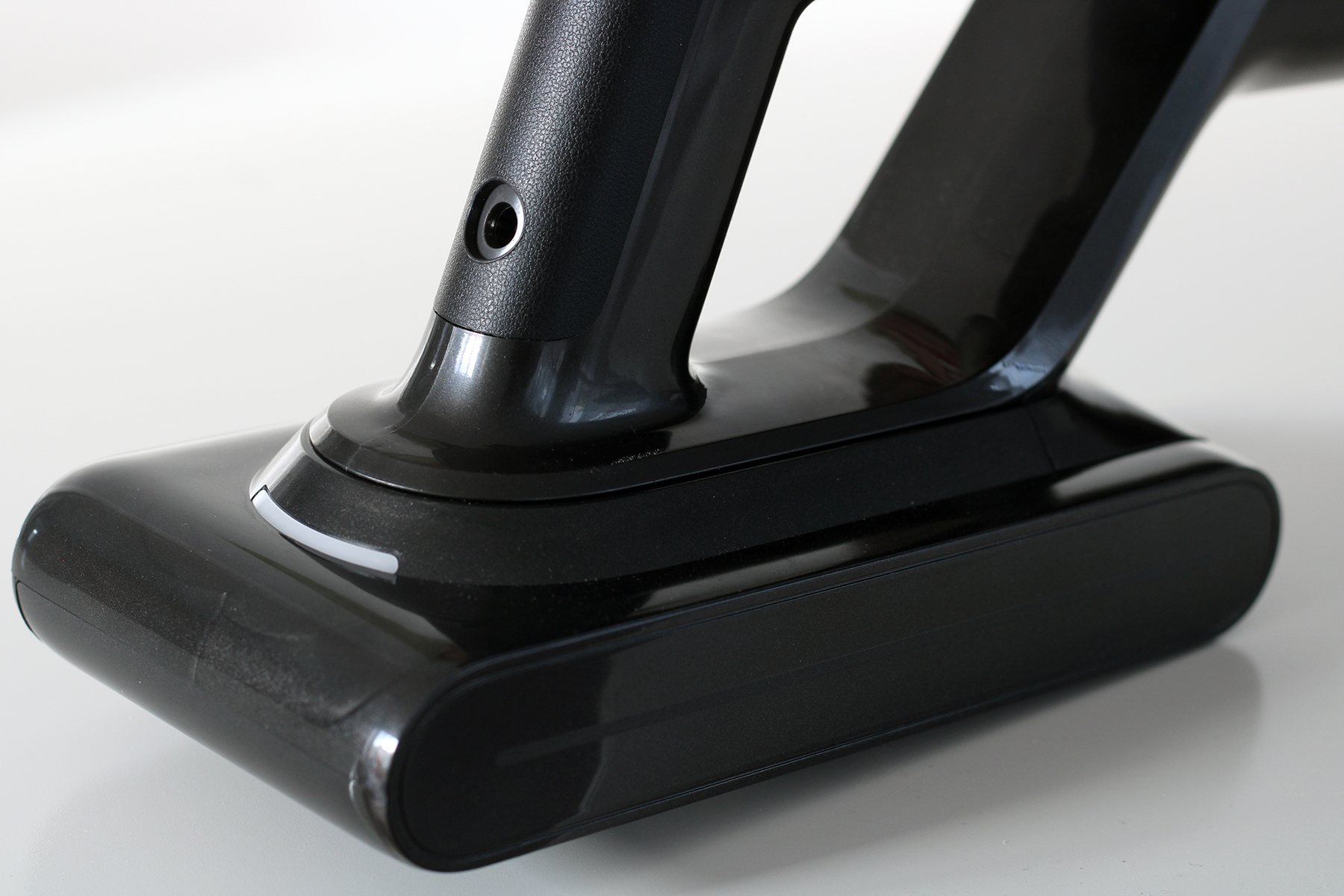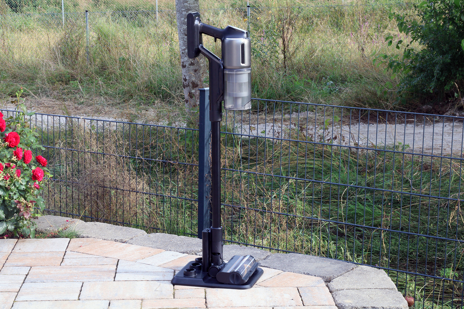 Wie bereits erwähnt, funktioniert das Klicksystem für die Verbindung der einzelnen Elemente sehr gut. Das Saugrohr und die verschiedenen Düsen und Aufsätze rasten sehr fest ein. Auf Knopfdruck lösen wir die Befestigung wieder. Einen kleinen Kritikpunkt haben wir beim einsetzbaren Knickgelenk, um leicht unter niedrigen Tischen oder Sofas saugen zu können. Dieses ist im Gegensatz zu vielen anderen Handstaubsaugern nicht fest in das Saugrohr integriert, sondern ein eigenes Element, das wir zwischen Motoreinheit und Rohr einklicken. Allerdings rastet es in der geraden Position nicht perfekt ein und hängt ganz leicht durch. Das führt dazu, dass das Rohr beim Saugen nicht perfekt stabil ist. Das wirkt zunächst wenig vertrauenerweckend, hat aber keinen großen Einfluss auf die Handhabung.