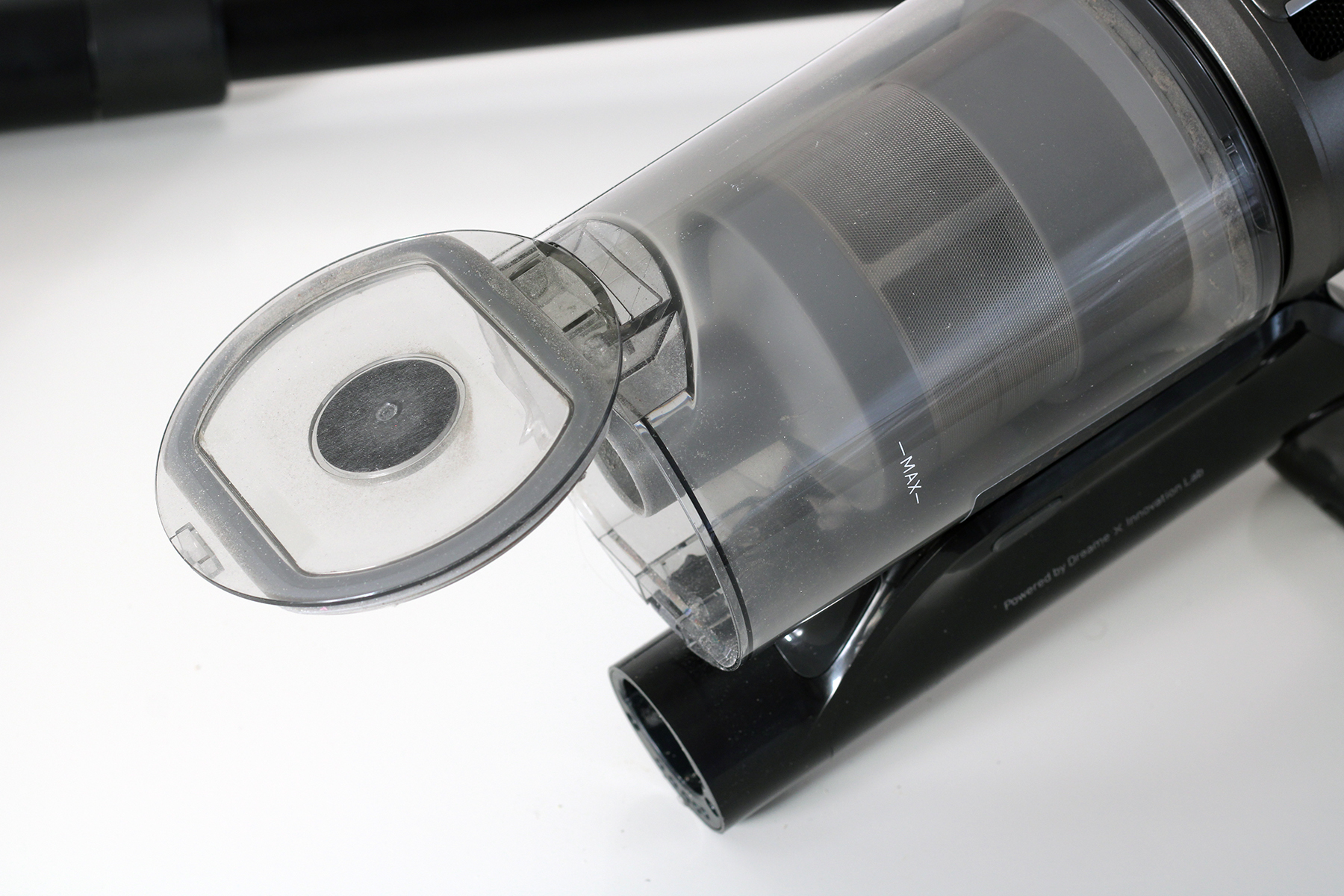 Der Staubbehälter fasst ordentliche 600 Milliliter. Wir können ihn mit nur einem Knopfdruck entleeren. Dann öffnet sich die Klappe an der Vorderseite und der Schmutz fällt heraus. Manchmal müssen wir durch Schütteln etwas nachhelfen, mehr ist aber nicht nötig, damit alles im Mülleimer landet. Um den Filter zu waschen, können wir den Behälter auch komplett entnehmen und in seine Einzelteile zerlegen. Apropos Filter: Dreame spendiert dem Z30 einen HEPA-Filter, was vor allem Allergikerinnen und Allergiker freuen dürfte.