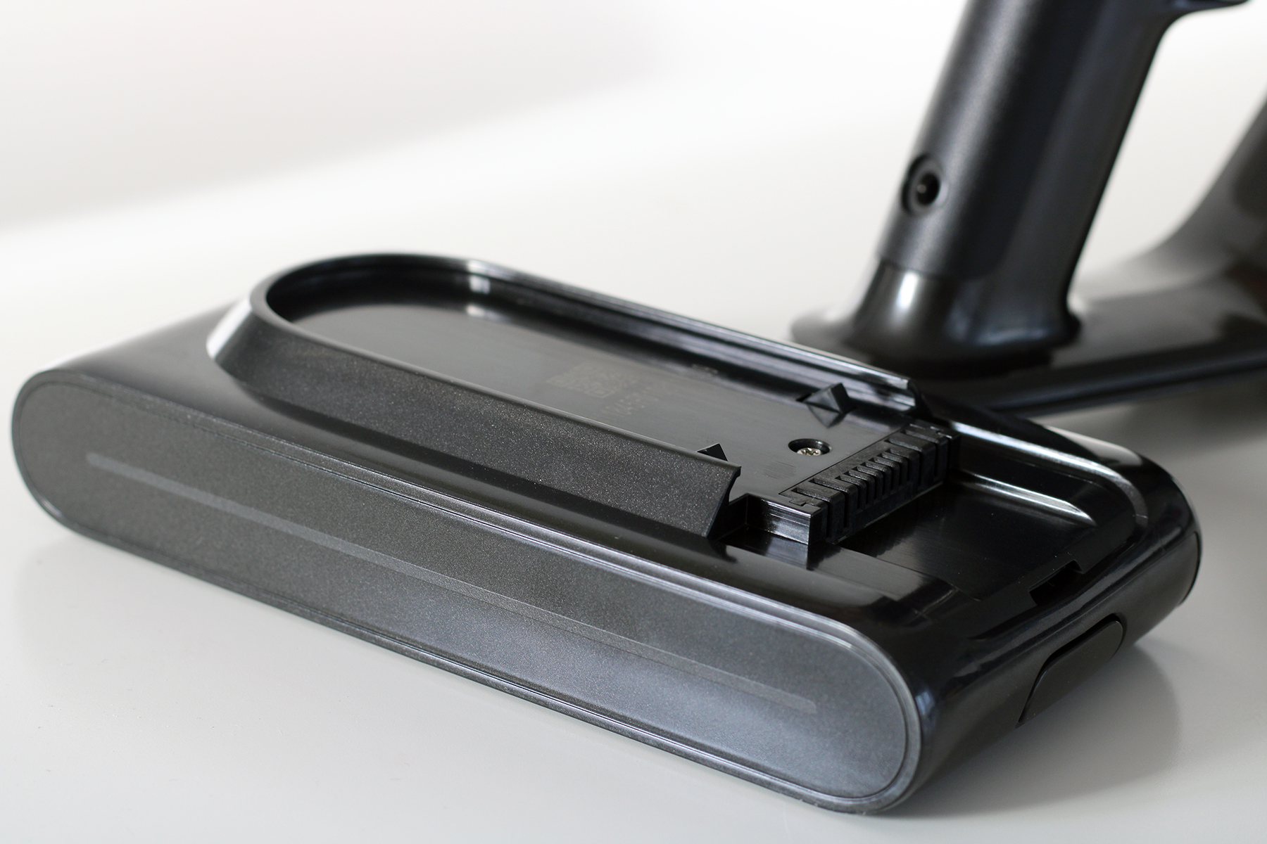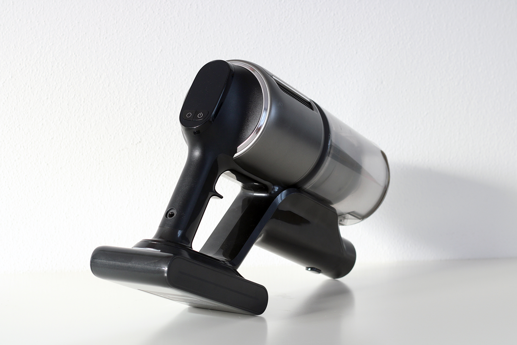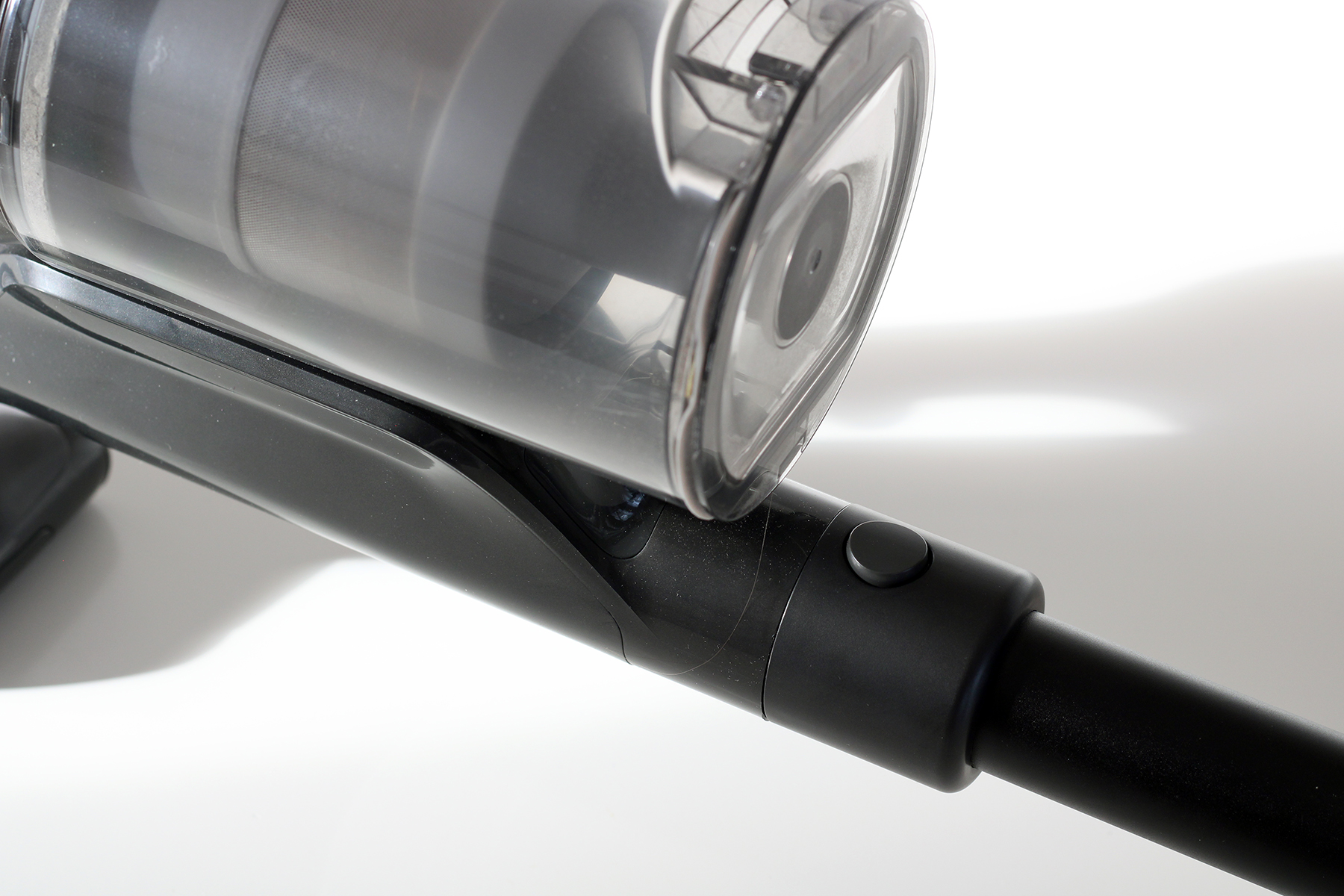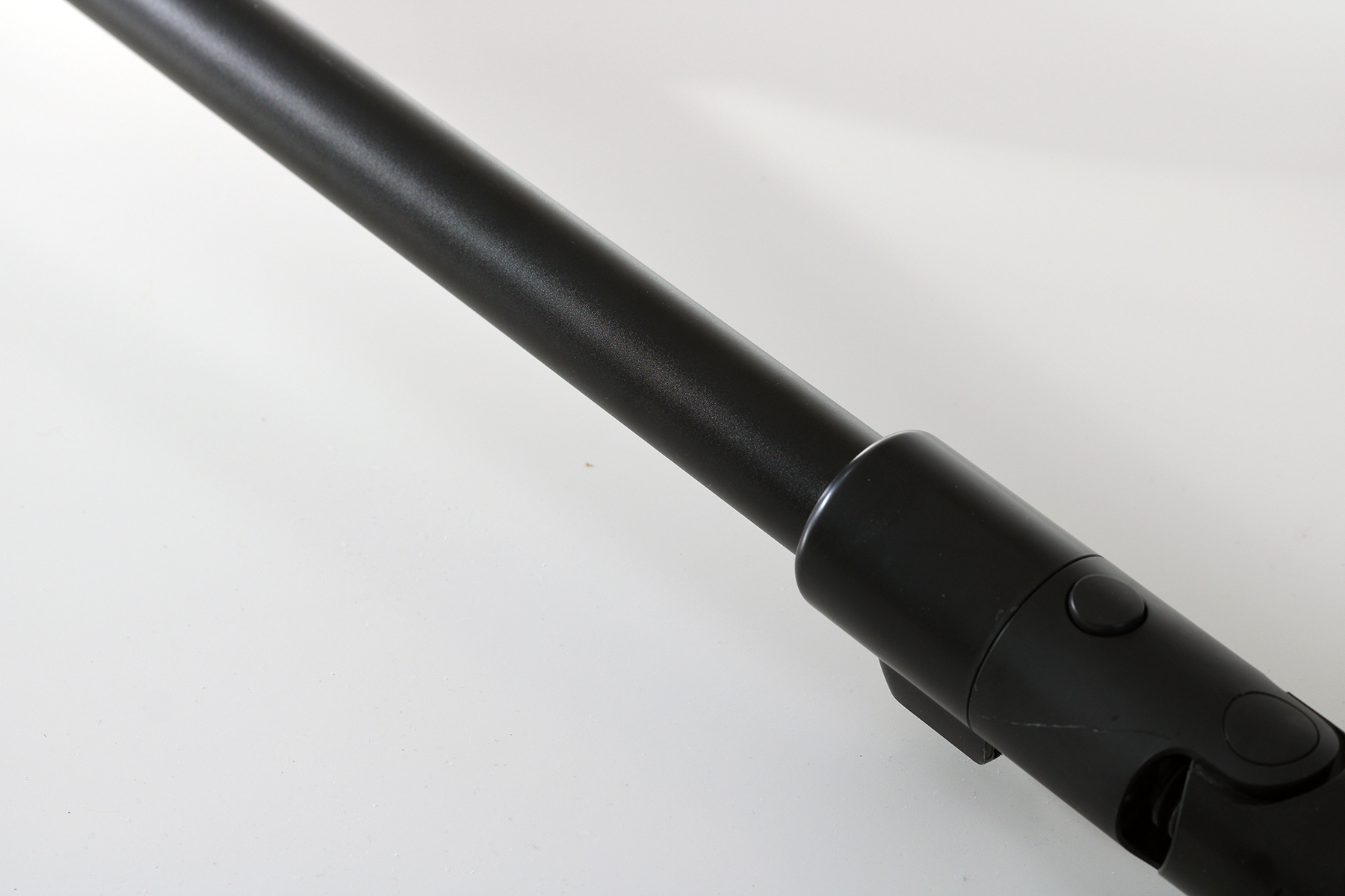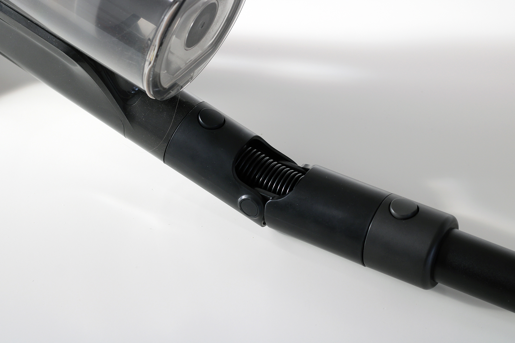 Wie bereits erwähnt, funktioniert das Klicksystem für die Verbindung der einzelnen Elemente sehr gut. Das Saugrohr und die verschiedenen Düsen und Aufsätze rasten sehr fest ein. Auf Knopfdruck lösen wir die Befestigung wieder. Einen kleinen Kritikpunkt haben wir beim einsetzbaren Knickgelenk, um leicht unter niedrigen Tischen oder Sofas saugen zu können. Dieses ist im Gegensatz zu vielen anderen Handstaubsaugern nicht fest in das Saugrohr integriert, sondern ein eigenes Element, das wir zwischen Motoreinheit und Rohr einklicken. Allerdings rastet es in der geraden Position nicht perfekt ein und hängt ganz leicht durch. Das führt dazu, dass das Rohr beim Saugen nicht perfekt stabil ist. Das wirkt zunächst wenig vertrauenerweckend, hat aber keinen großen Einfluss auf die Handhabung.