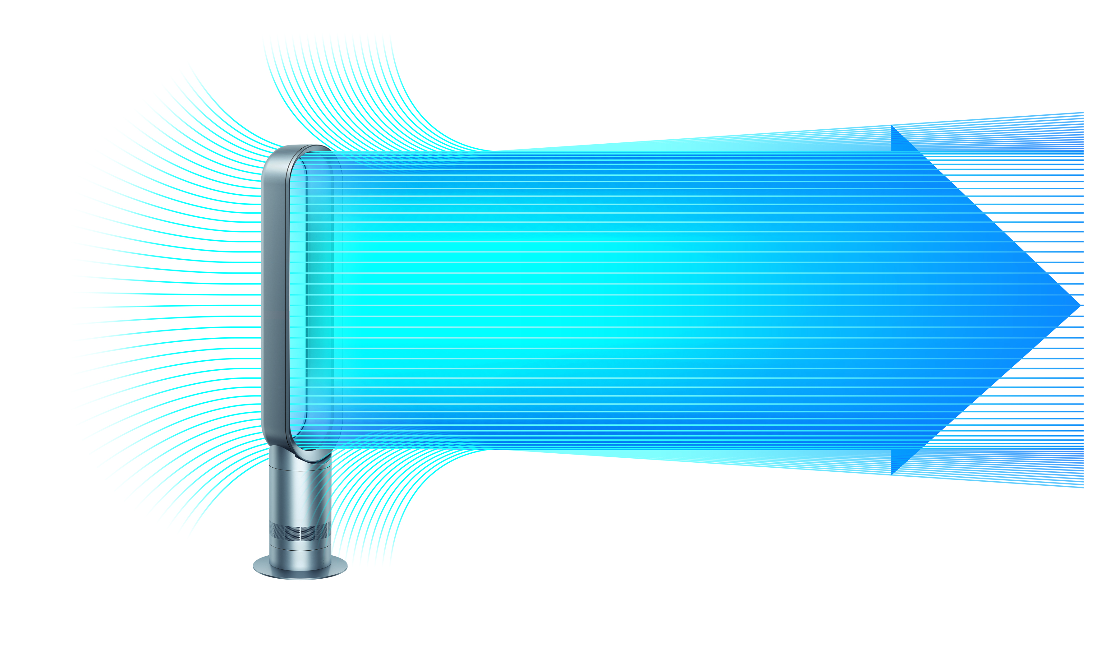Wie bereits erwähnt, benötigt der Dyson AM07 kein Rotorblatt. Die Luft wird durch einen Motor im Sockel angesaugt und in den Luftring transportiert. Durch den schmalen Schlitz wird die Luft beschleunigt und tritt gleichmäßig und mit hoher Geschwindigkeit aus. Dabei wird der Strom über die tragflächenförmige Schräge geleitet. So entsteht Unterdruck und die Umgebungsluft wird angesaugt. Dyson nennt dies Air-Multiplier-Technologie. Uns hat der angenehme Luftstrom beeindruckt. Im Gegensatz zu vielen anderen Ventilatoren kühlt der Dyson auch, wenn er nicht direkt auf den Nutzer gerichtet ist. Auf der höchsten Stufe bläst der AM07 ordentlich. Hier spielt das Gerät den Vorteil aus, dass die beiden Seiten eng beieinander liegen und den Luftstrom gegenseitig verstärken. Das Ergebnis ist auch in fünf bis sechs Metern Entfernung noch zu spüren.