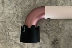 Der Dyson Supersonic r macht direkt beim Auspacken einen sehr hochwertigen Eindruck. Der Kunststoff wirkt robust und langlebig – nichts wackelt, nichts wirkt billig. Besonders beeindruckend ist die Hitzebeständigkeit: Auch bei längerer Nutzung bleibt das Gehäuse angenehm kühl. Scharfe Kanten oder sichtbare Mängel entdecken wir nicht, alles ist rundum sauber verarbeitet. Das verleiht dem Gerät nicht nur ein edles Aussehen, sondern auch Vertrauen in seine Alltagstauglichkeit. Uns sagt die Farbgebung ceramic pink/roségold zu.